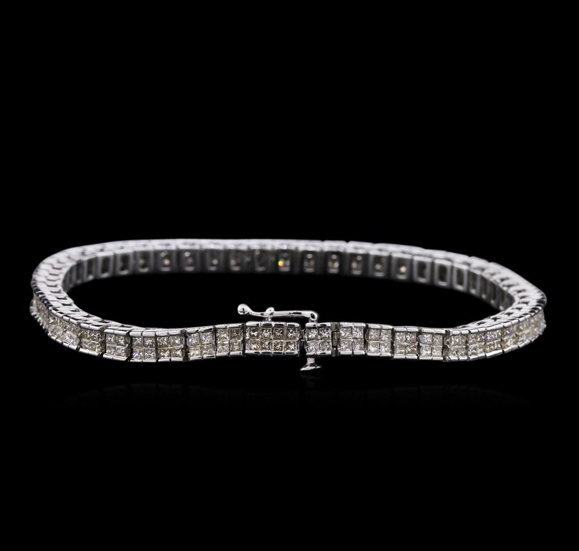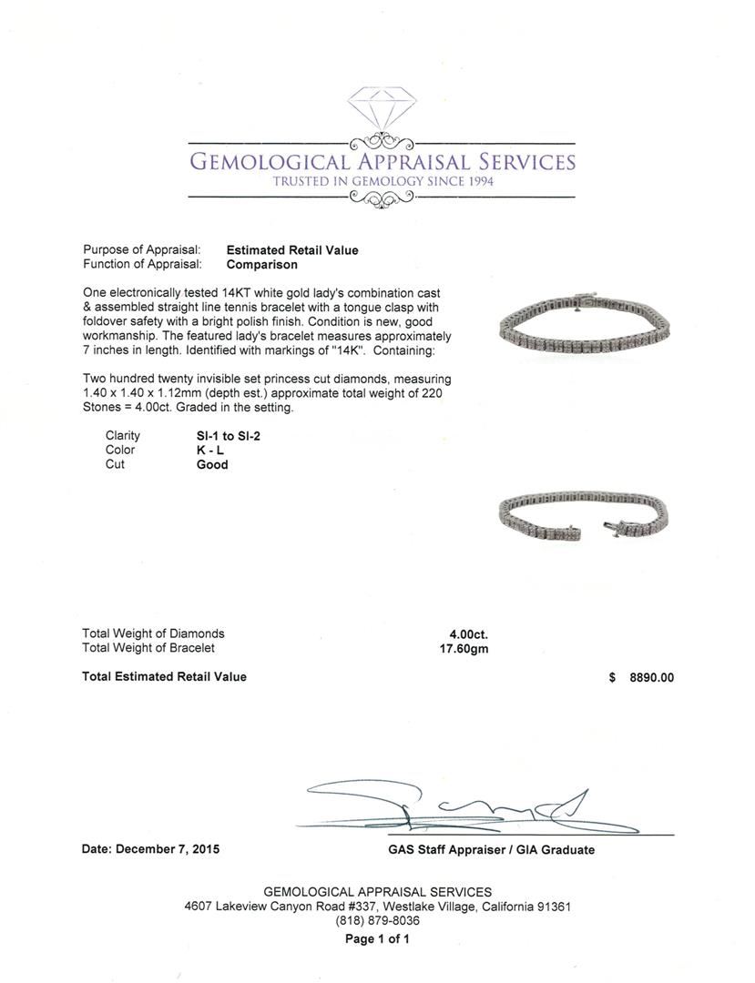 One electronically tested 14KT white gold lady's combination cast & assembled straight line tennis bracelet with a tongue clasp with foldover safety with a bright polish finish. The featured lady's bracelet measures approximately 7 inches in length. Identified with markings of "14K". Condition is new, good workmanship. Containing: Two Hundred Twenty invisible set princess cut diamonds, measuring 1.40 x 1.40 x 1.12mm (depth est.) approximate total weight of 220 Stones = 4.00ct. Graded in the setting. Clarity: SI-1 to SI-2. Color: K - L. Cut Good. Total Weight of Diamonds 4.00ct. Total Weight of Bracelet 17.60gm. GAS Appraised at $8,890.00.