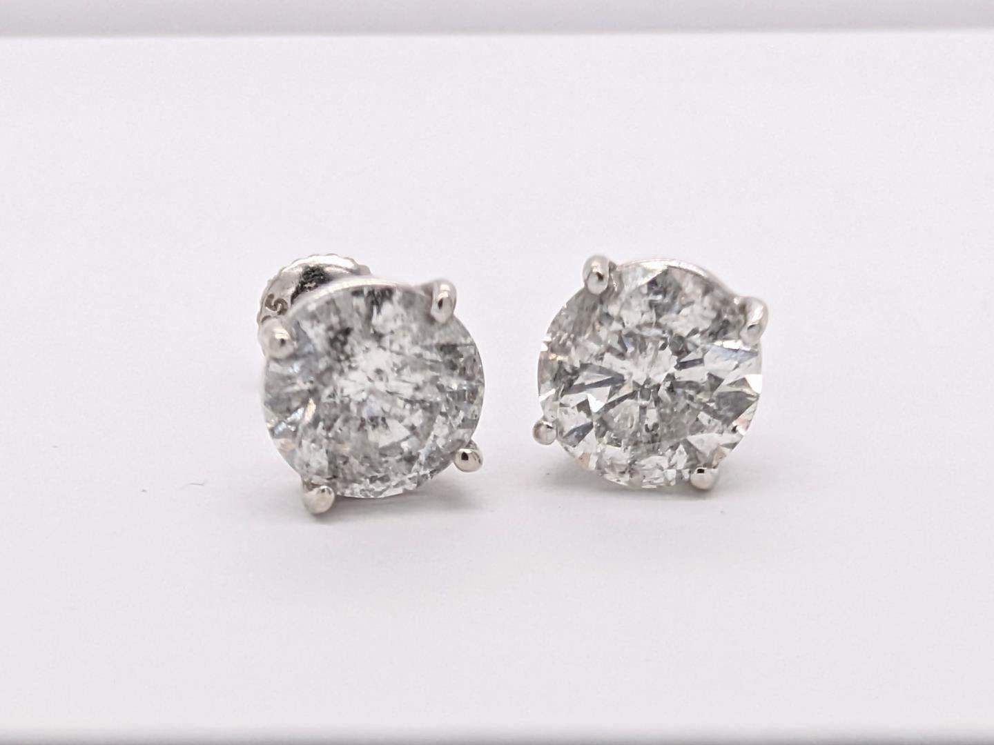 This pair of platinum stud earrings features two round brilliant cut diamonds with a total weight of 4.01ct, set in bright-polish basket settings with threaded posts. One diamond weighs approximately 2.00ct and the other 2.01ct, both graded I-2 clarity, H-I color, and Good cut. The earrings are marked "PT 950" and display like-new condition with good workmanship. Total earring weight is 2.50 grams, and the diamonds are graded in the setting.