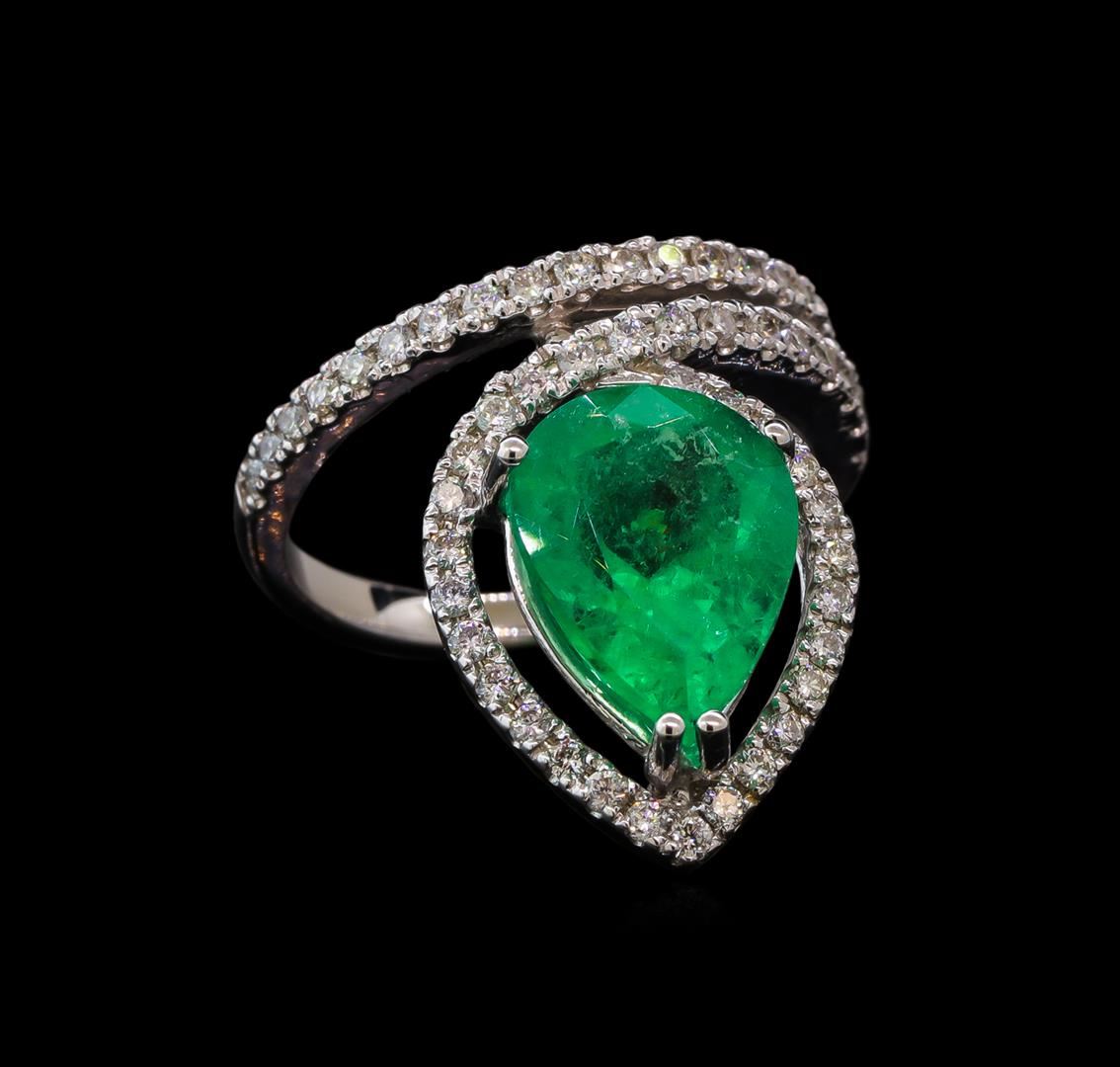 One electronically tested 14KT white gold lady's cast fashion ring with a bright polish finish. The featured lady's ring has an overlapping wraparound halo and a shank measuring 2.18 millimeters wide. Identified with markings of '14K'. Condition is new, good workmanship. Containing: One prong set pear modified brilliant cut natural emerald, measuring 12.68 x 9.36 x 7.16mm, (depth est.) approximate weight of 4.01ct., clarity is heavily included, medium light, moderately strong, green color, (GIA G 4/4), cut is good. Transmitting light somewhat diffusely, semi-transparent to translucent. Naturally occurring internal & external characteristics are present. Indications of oil residue. Colored gemstones are presumed to have been subjected to commonly used enhancement processes. Graded in the setting. Fifty-Three prong set round brilliant cut diamonds, measuring 1.50 - 1.40 x 0.90mm (depth est.) approximate total weight of 53 Stones = 0.62ct. Graded in the setting. Clarity SI-1 to SI-2. Color: H - I Cut Good. Total Weight of Colored Stones 4.01ct. Total Weight of Diamonds 0.62ct. Total Weight of Ring 6.60gm. GAS Appraised at $8,080.00.