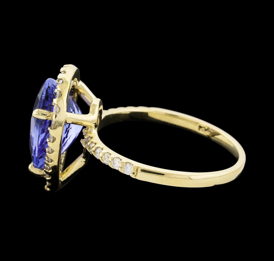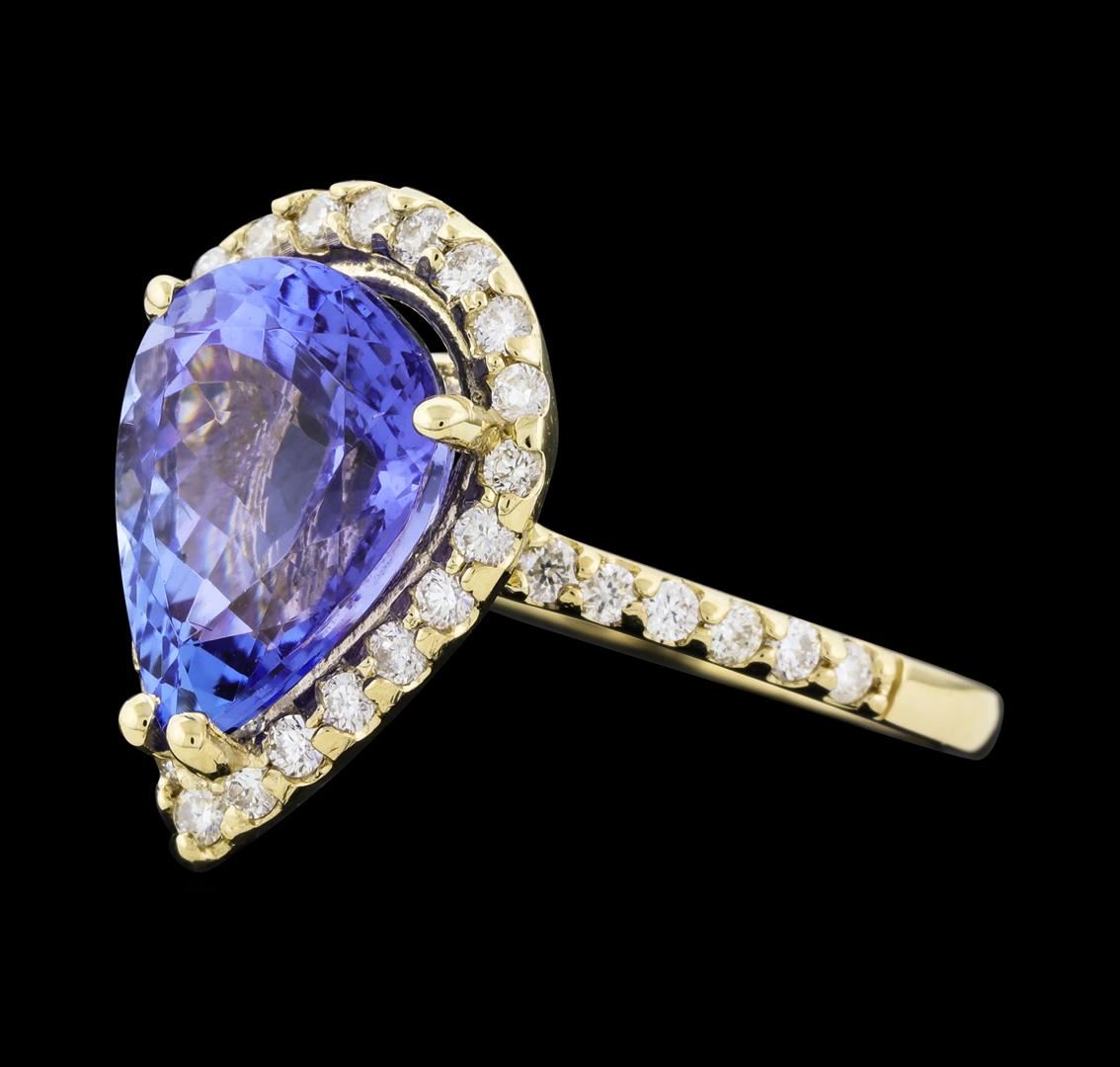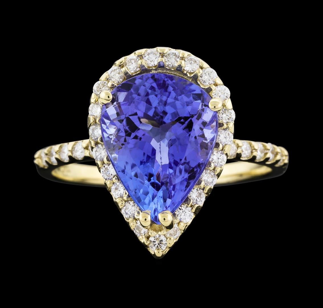 One electronically tested 14KT yellow gold lady's cast fashion ring with a basket halo with a bright polish finish. The featured lady's ring has a shank measuring 1.53 millimeters wide. Identified with markings of 'K14'. Condition is new, good workmanship. Containing: One prong set pear modified brilliant cut natural tanzanite, measuring 11.80 x 9.08 x 6.06mm, (depth est.) approximate weight of 4.01ct., clarity is eye clean, medium, very slightly grayish, violet color, (GIA V 5/3), cut is good. Transmitting light with no distortion, transparent. Colored gemstones are presumed to have been subjected to commonly used enhancement processes. Graded in the setting. Thirty-Five prong set round brilliant cut diamonds, measuring 1.50 - 1.40 x 0.90mm (depth est.) approximate total weight of 35 Stones = 0.41ct. Graded in the setting. Clarity SI-1 to I-1. Color: H - I Cut Good. Total Weight of Colored Stones 4.01ct.. Total Weight of Diamonds 0.41ct.. Total Weight of Ring 3.50gm. GAS Appraised at $6,215.00.