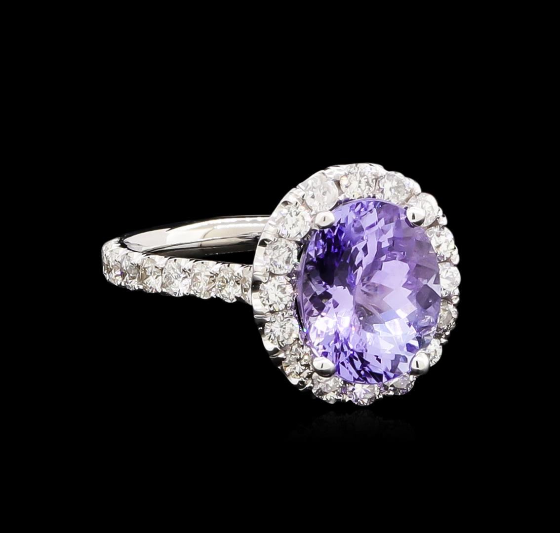 One electronically tested 14KT white gold ladies cast tanzanite and diamond ring with a bright polish finish. The featured tanzanite is set a diamond bezel supported by a tuliped under gallery and diamond ribbon shoulders, completed by a two millimeter wide band. Identified with markings of "14K". Condition is new, good workmanship. Containing: One prong set oval mixed cut natural tanzanite, measuring 10.40 x 8.30 x 6.00mm, 10%. bulge factor, approximate weight of 4.01ct., clarity is eye clean, type I, medium, very slightly grayish, violet color, (GIA V 5/3), cut is good. Transmitting light with no distortion, transparent. Graded in the setting. Tanzanite is a very rare gemstone that is only found in the country of Tanzania. Originally discovered in 1967. Tiffany & Company, named the stone Tanzanite. It is found in the Usumburu Mountains that border the Umba Valley of northern Tanzania. Tanzanite occurs in gray, brown, violet, blue, reddish-purple, & green. The gem is interesting because of its exceptional pleochroism. Rotated in different directions a tanzanite will exhibit multiple changes of color. Tanzanite has a low tolerance to ultrasonic cleaning, and should not be cleaned using this method. Thirty-Four prong set round brilliant cut diamonds, measuring 2.00 - 2.00 x 1.20mm (depth est.) approximate total weight of 34 Stones = 1.09ct. Graded in the setting. Clarity: SI-2 to I-2. Color: G - I. Total Weight of Colored Stones 4.01ct. Total Weight of Diamonds 1.09ct. Total Weight of Ring 4.91gm. AIG Appraised at $10,125.00.