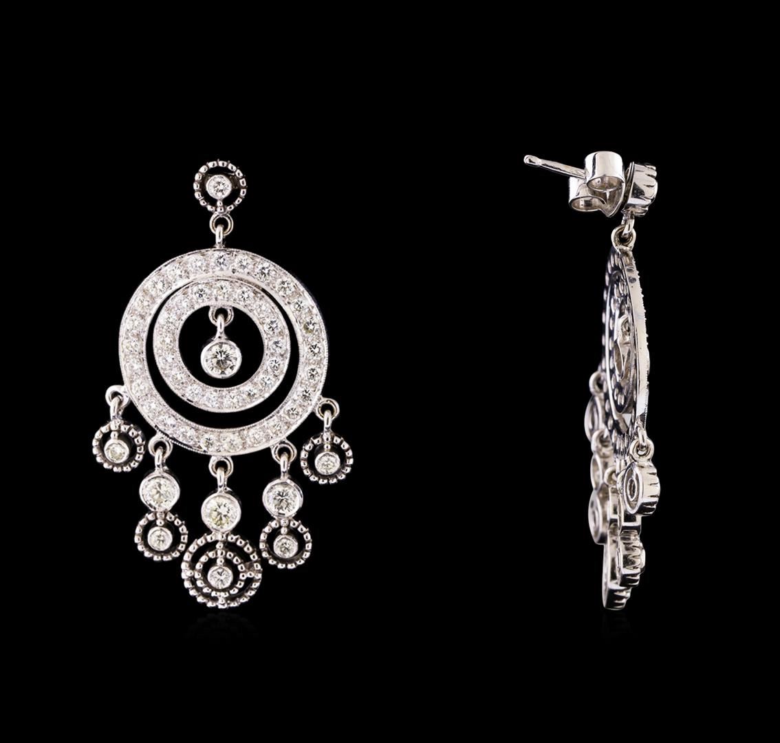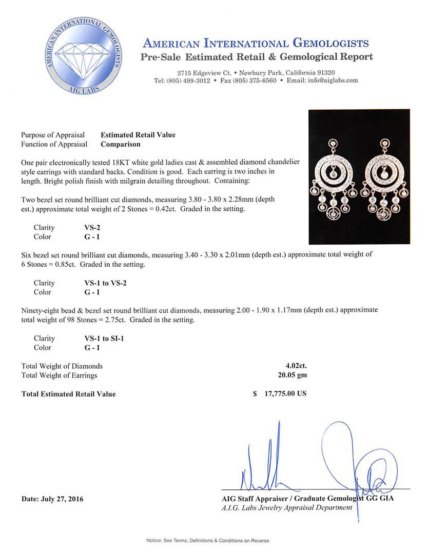 One pair electronically tested 18KT white gold ladies cast & assembled diamond chandelier style earrings with standard backs. Each earring is two inches in length. Bright polish finish with milgrain detailing throughout. Condition is good. Containing: Two bezel set round brilliant cut diamonds, measuring 3.80 - 3.80 x 2.28mm (depth est.) approximate total weight of 2 Stones = 0.42ct. Graded in the setting. Clarity VS-2. Color: G - I Six bezel set round brilliant cut diamonds, measuring 3.40 - 3.30 x 2.01mm (depth est.) approximate total weight of 6 Stones = 0.85ct. Graded in the setting. Clarity VS-1 to VS-2. Color: G - I Ninety-Eight bead & bezel set round brilliant cut diamonds, measuring 2.00 - 1.90 x 1.17mm (depth est.) approximate total weight of 98 Stones = 2.75ct. Graded in the setting. Clarity VS-1 to SI-1. Color: G - I. Total Weight of Diamonds 4.02ct.. Total Weight of Earrings 20.05gm. AIG Appraised at $17,775.00.