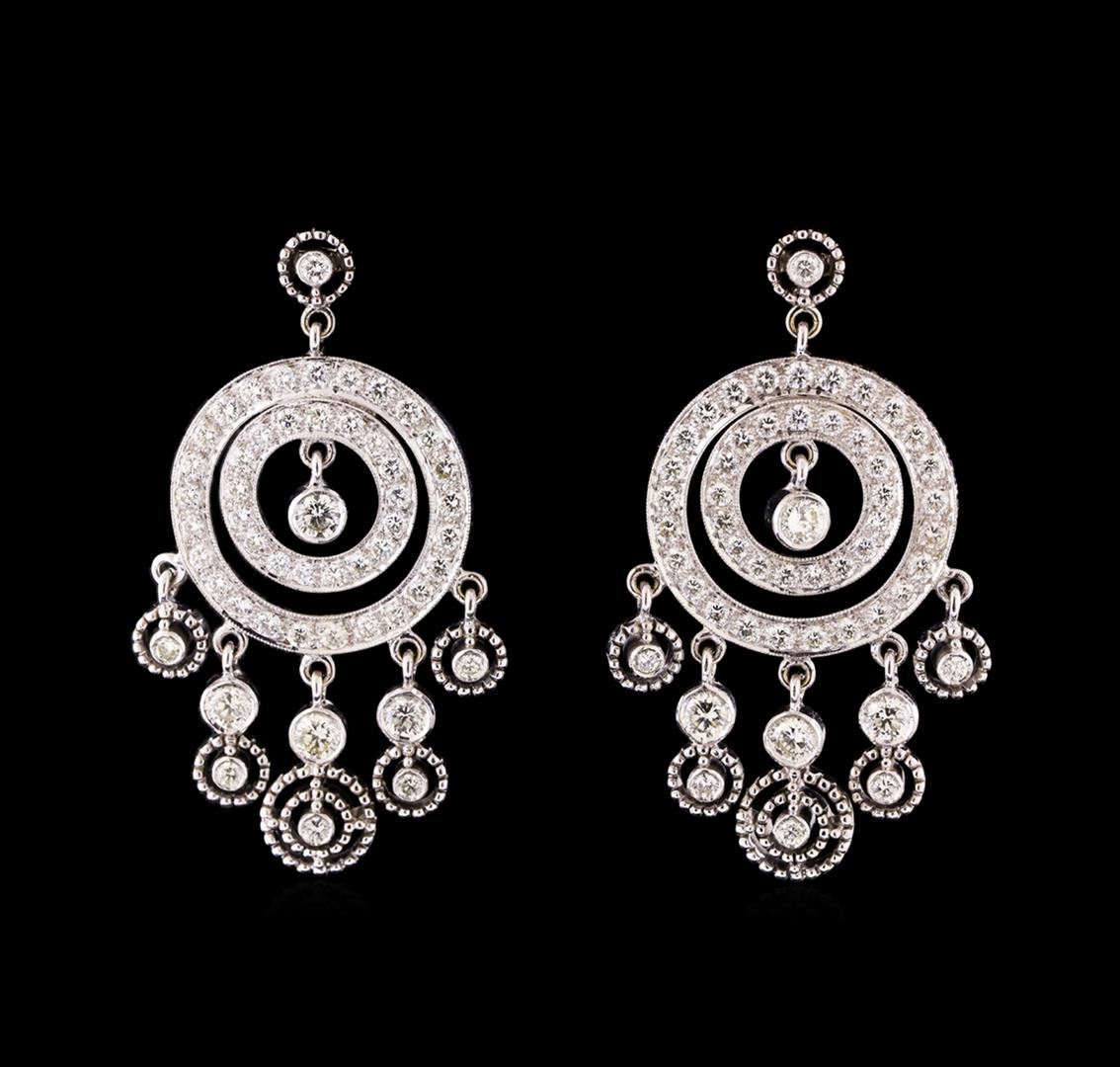 One pair electronically tested 18KT white gold ladies cast & assembled diamond chandelier style earrings with standard backs. Each earring is two inches in length. Bright polish finish with milgrain detailing throughout. Condition is good. Containing: Two bezel set round brilliant cut diamonds, measuring 3.80 - 3.80 x 2.28mm (depth est.) approximate total weight of 2 Stones = 0.42ct. Graded in the setting. Clarity VS-2. Color: G - I Six bezel set round brilliant cut diamonds, measuring 3.40 - 3.30 x 2.01mm (depth est.) approximate total weight of 6 Stones = 0.85ct. Graded in the setting. Clarity VS-1 to VS-2. Color: G - I Ninety-Eight bead & bezel set round brilliant cut diamonds, measuring 2.00 - 1.90 x 1.17mm (depth est.) approximate total weight of 98 Stones = 2.75ct. Graded in the setting. Clarity VS-1 to SI-1. Color: G - I. Total Weight of Diamonds 4.02ct.. Total Weight of Earrings 20.05gm. AIG Appraised at $17,775.00.