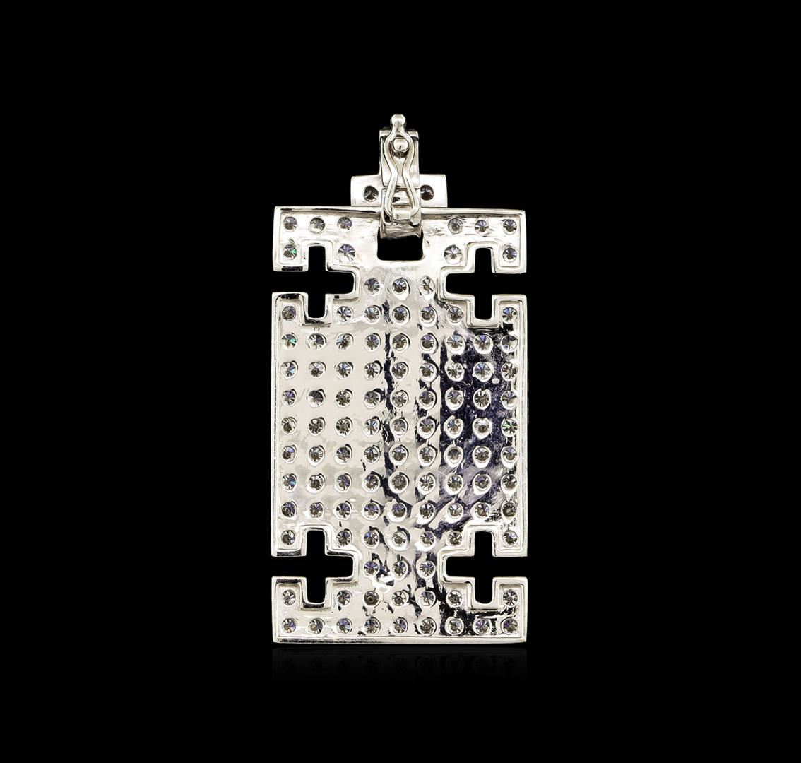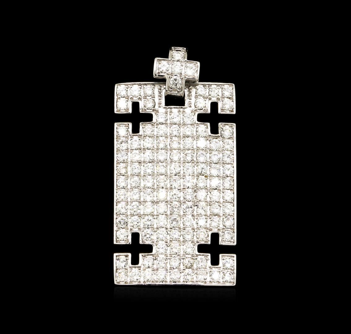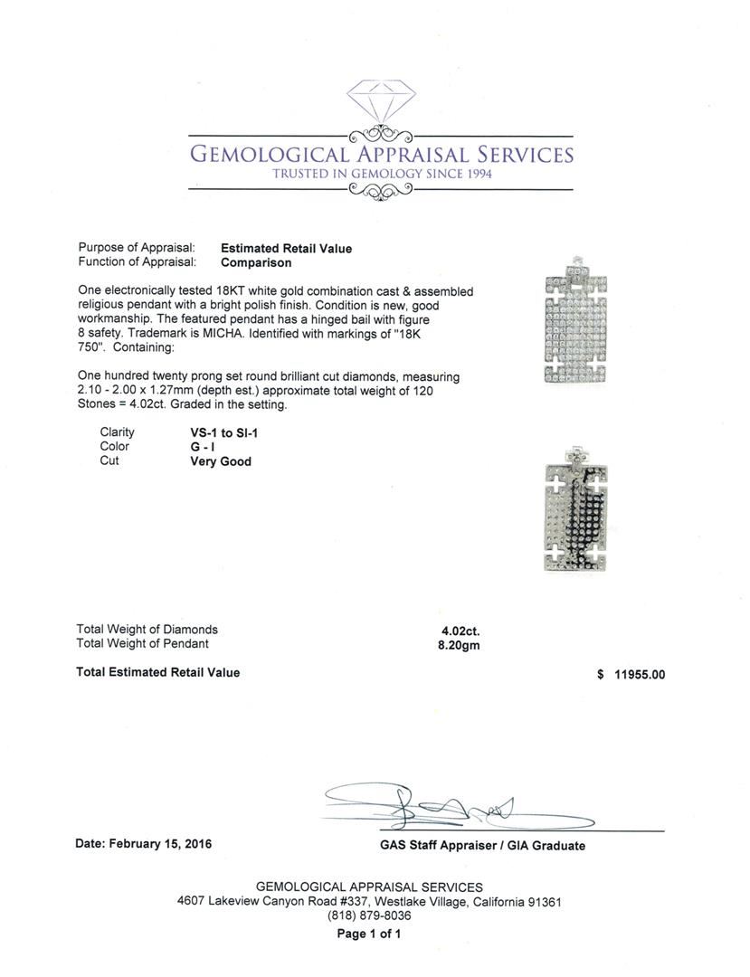 One electronically tested 18KT white gold combination cast & assembled religious pendant with a bright polish finish. The featured pendant has a hinged bail with figure 8 safety. Trademark is MICHA. Identified with markings of "18K 750". Condition is new, good workmanship. Containing: One Hundred Twenty prong set round brilliant cut diamonds, measuring 2.10 - 2.00 x 1.27mm (depth est.) approximate total weight of 120 Stones = 4.02ct. Graded in the setting. Clarity: VS-1 to SI-1. Color: G - I. Cut Very Good. Total Weight of Diamonds 4.02ct. Total Weight of Pendant 8.20gm. GAS Appraised at $11,955.00.