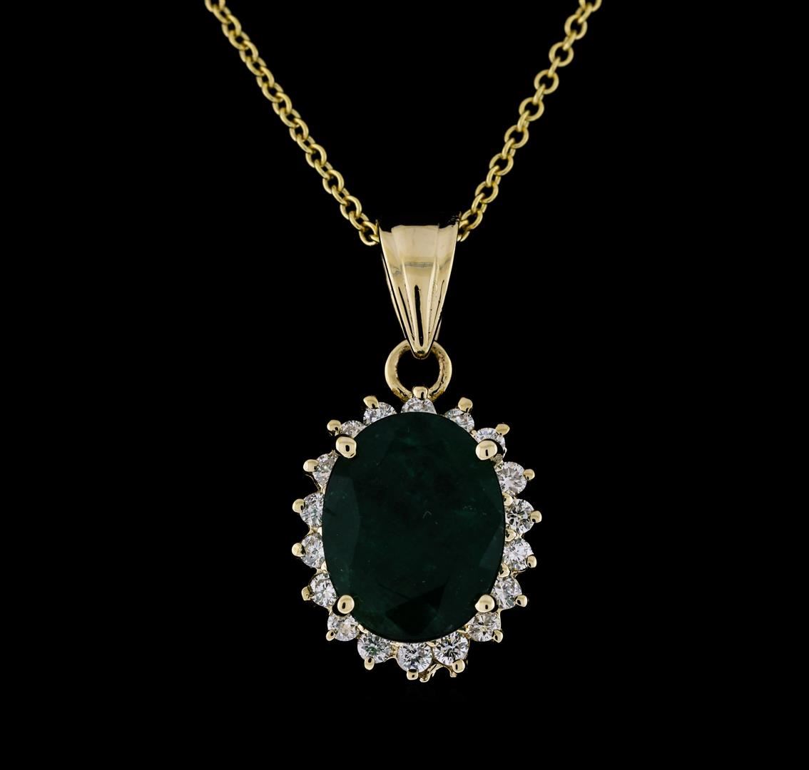 One pendant with chain : 14KT yellow gold weighing 2.88gm featuring emerald with a total weight of 4.02ct and diamonds weighing 0.37ctw.