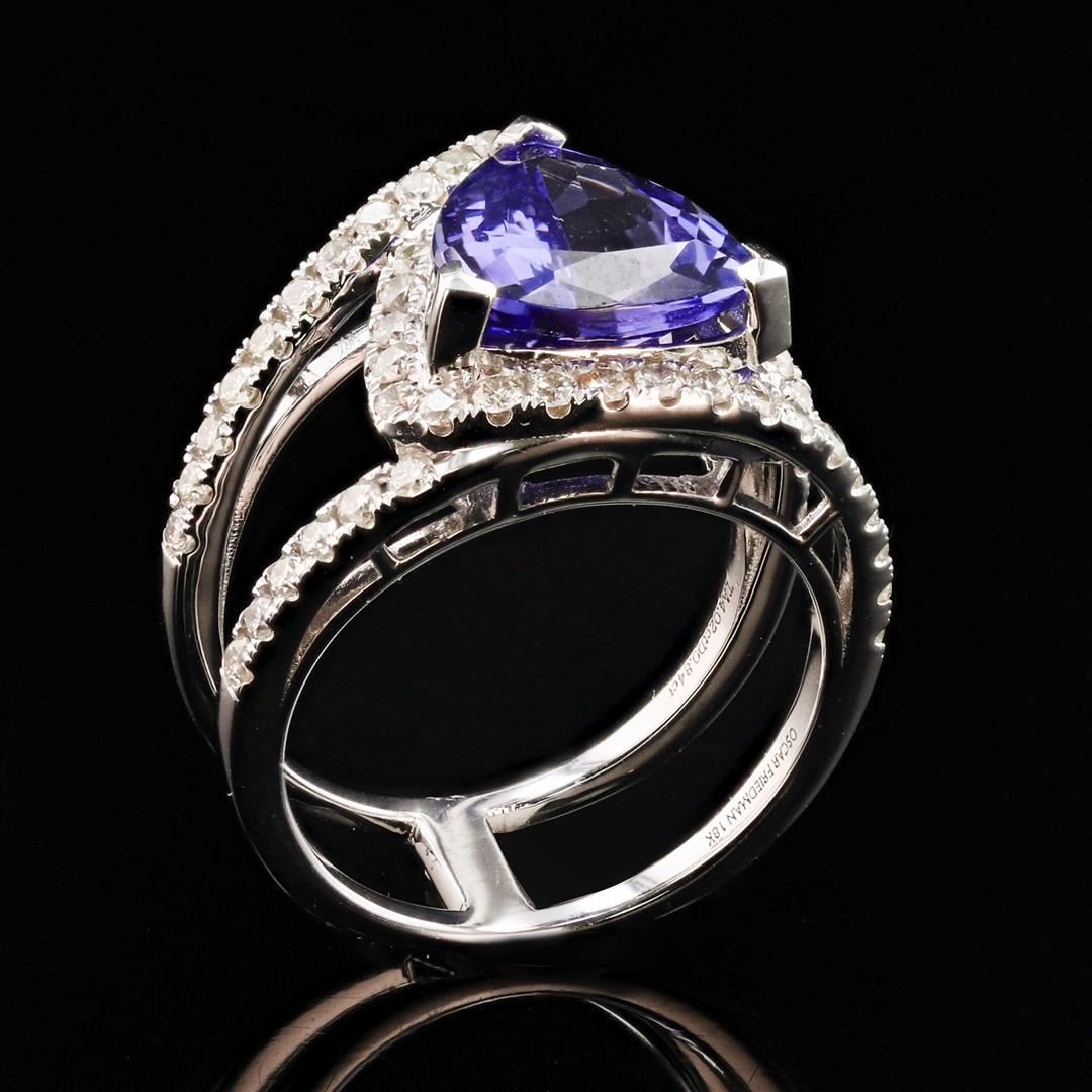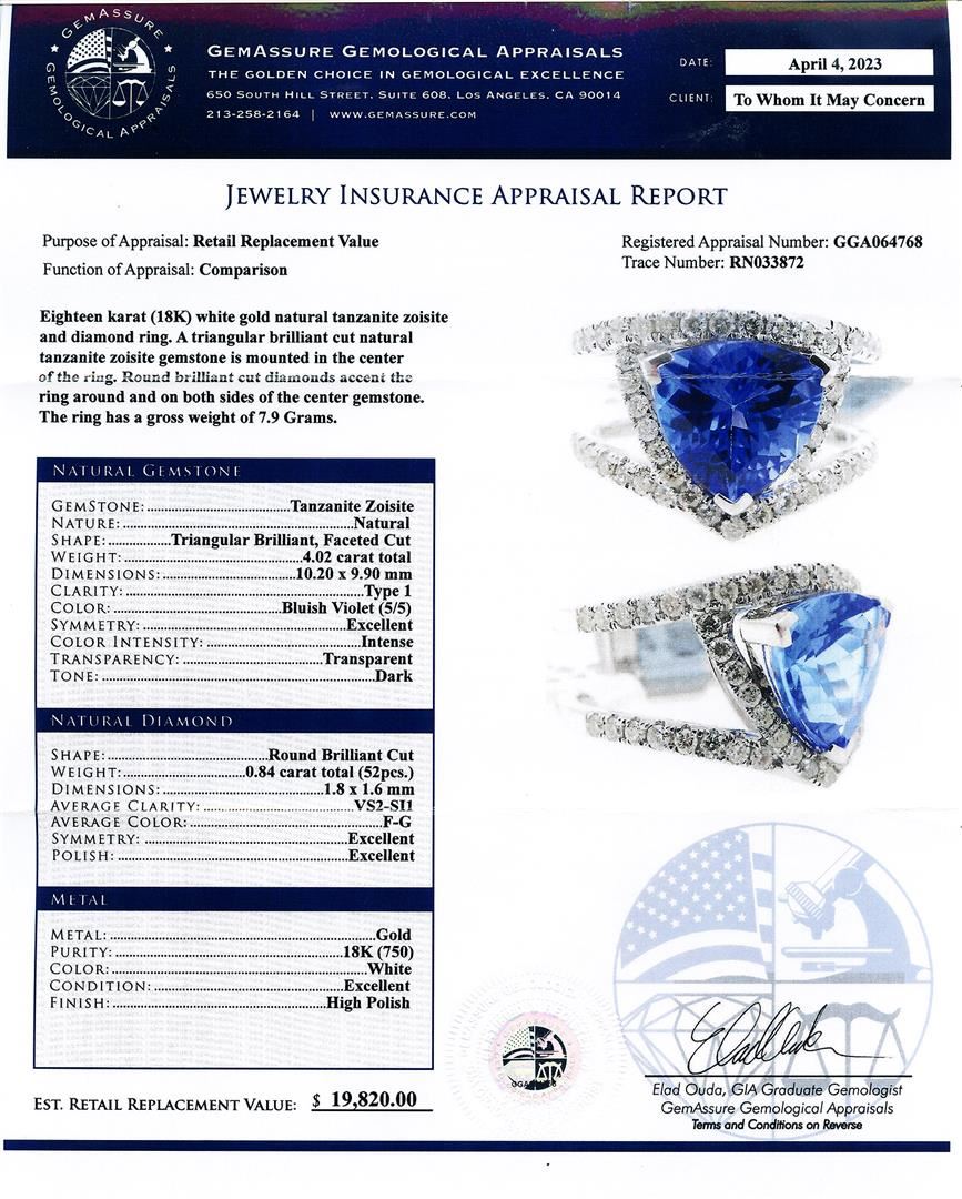 4.02ct Tanzanite and 0.84ctw Diamond 18K White Gold Ring. Eighteen karat (18K) white gold natural tanzanite zoisite and diamond ring. A triangular brilliant cut natural tanzanite zoisite gemstone is mounted in the center of the ring. Round brilliant cut diamonds accent the ring around and on both sides of the center gemstone. The ring has a gross weight of 7.9 Grams. NATURAL GEMSTONE GEMSTONE: Tanzanite Zoisite NATURE: Natural SHAPE: Triangular Brilliant, Faceted Cut WEIGHT: 4.02 carat total DIMENSIONS: 10.20 x 9.90mm CLARITY: Type 1 COLOR: Bluish Violet (5/5) SYMMETRY: Excellent COLOR INTENSITY: Intense TRANSPARENCY: Transparent TONE: Dark NATURAL DIAMOND SHAPE: Round Brilliant Cut WEIGHT: 0.84 carat total (52pcs.) DIMENSIONS: 1.8 x 1.6mm AVERAGE CLARITY: VS2-SI1 AVERAGE COLOR: F-G SYMMETRY: Excellent POLISH: Excellent METAL METAL: Gold PURITY: 18K (750) COLOR: White CONDITION: Excellent FINISH: High Polish