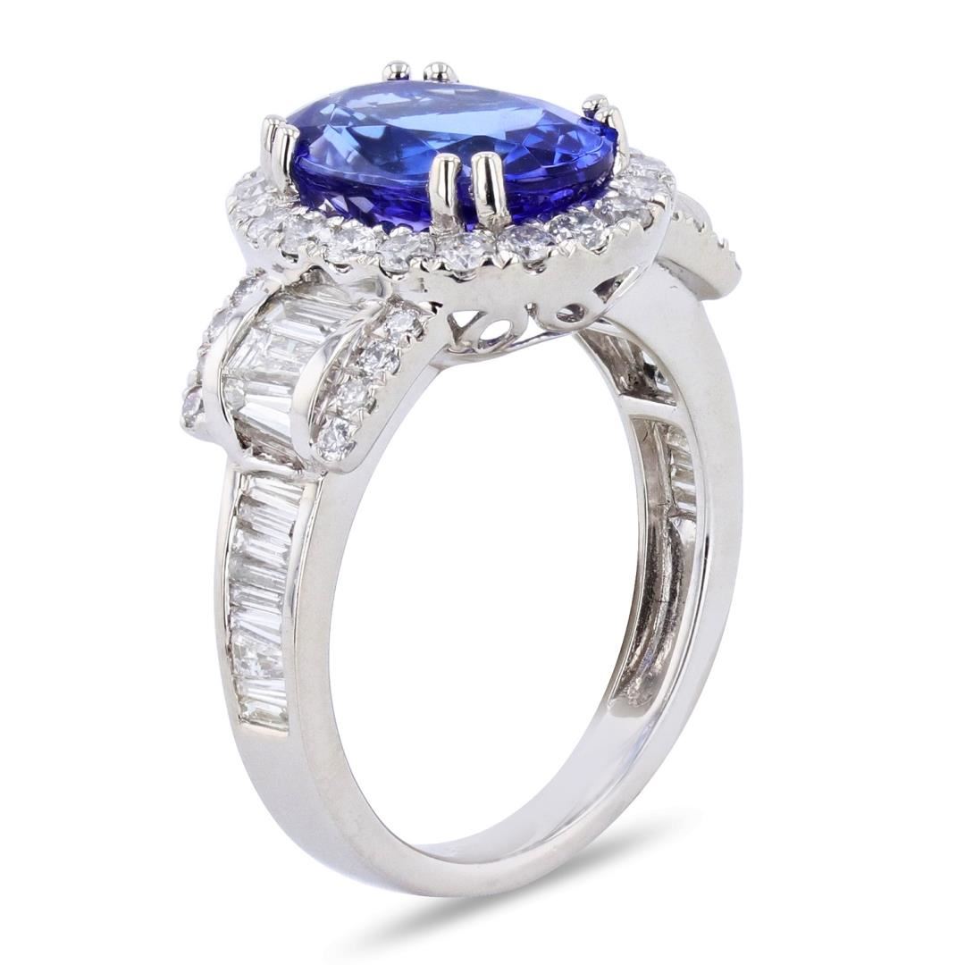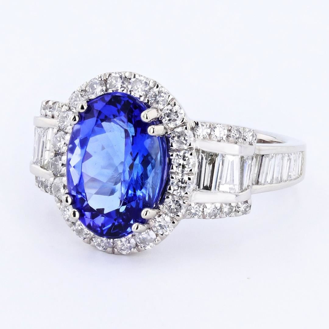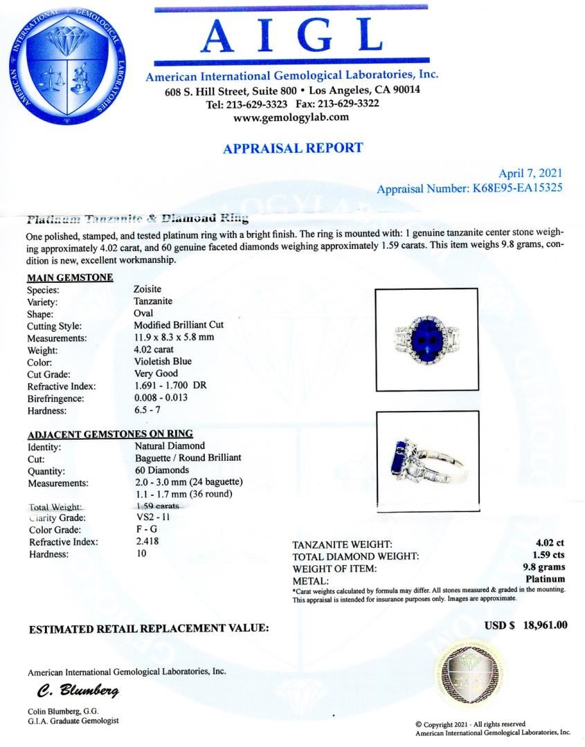 One polished, stamped, and tested platinum ring with a bright finish. The ring is mounted with: 1 genuine tanzanite center stone weigh-ing approximately 4.02 carat, and 60 genuine faceted diamonds weighing approximately 1.59 carats. This item weighs 9.8 grams, condition is new, excellent workmanship. #MAIN GEMSTONE# Species: Zoisite Variety: Tanzanite Shape: Oval Cutting Style: Modified Brilliant Cut Measurements: 11.9 x 8.3 x 5.8mm Weight: 4.02 carat Color: Violetish Blue Cut Grade: Very Good Refractive Index: 1.691 - 1.700 DR Birefringence: 0.008 - 0.013 Hardness: 6.5 - 7#ADJACENT GEMSTONES ON RING# Identity: Natural Diamond Cut: Baguette / Round Brilliant Quantity: 60 Diamonds Measurements: 2.0 - 3.0mm (24 baguette), 1.1 - 1.7mm (36 round) Tota1 Weight: 1.59 carats Clarity Grade: VS2 - I1 Color Grade: F - G Refractive Index: 2.418 Hardness: 10 TANZANITE WEIGHT: 4.02 ct TOTAL DIAMOND WEIGHT: 1.59 cts WEIGHT OF ITEM: 9.8 grams METAL: Platinum Size: 7 1/4