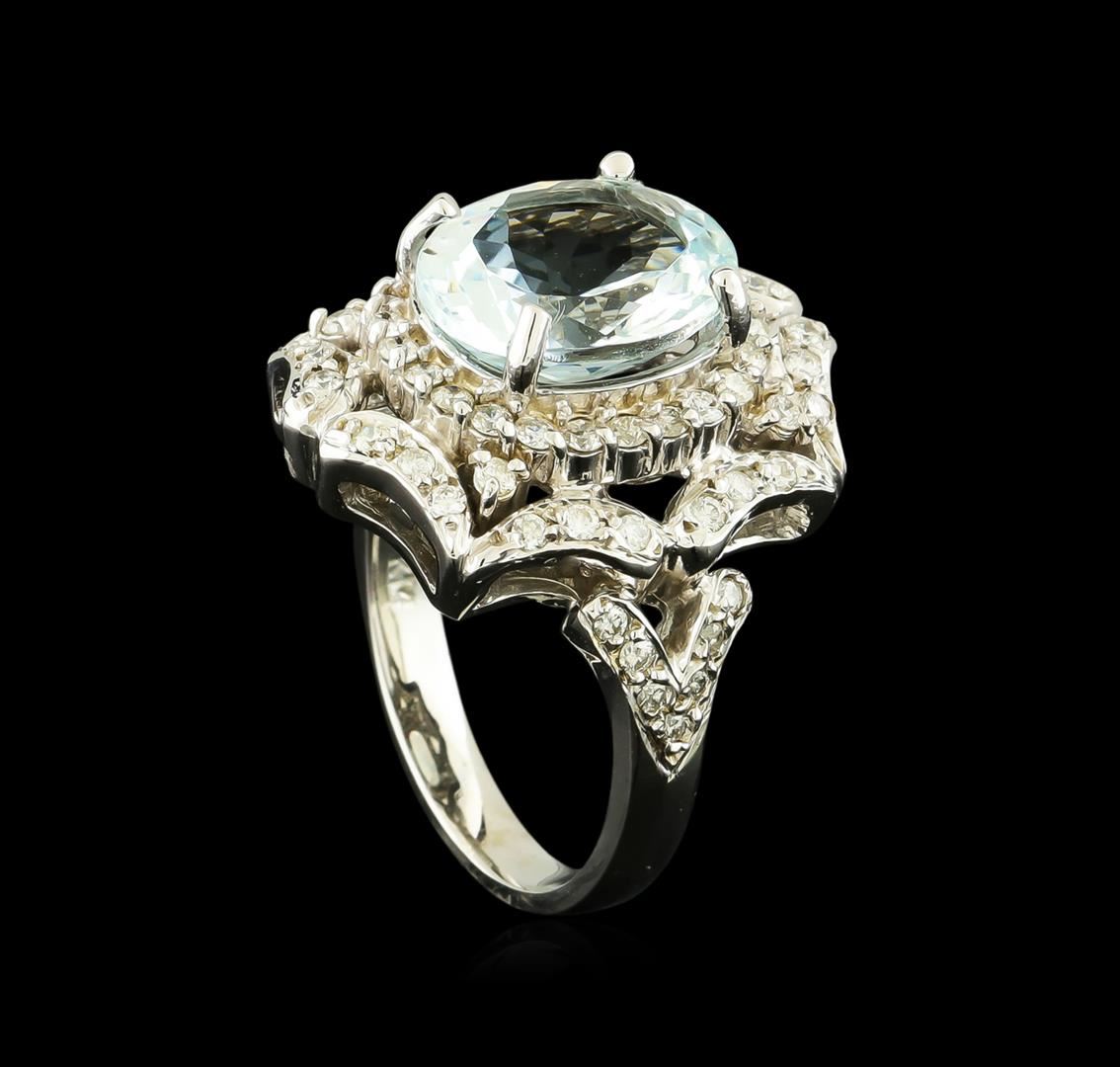 One electronically tested 14KT white gold lady's cast fashion ring with a bright polish finish. The featured lady's ring has a shank measuring 2.80 millimeters wide. Identified with markings of "14K". Condition is new, good workmanship. Containing: One prong set oval modified brilliant cut natural aquamarine, measuring 11.90 x 10.04 x 5.60mm, 5%. bulge factor, approximate weight of 4.03ct., clarity is eye clean, type I, very light, very slightly grayish, very slightly greenish blue color, (GIA vslgB 2/3), cut is very good. Transmitting light with no distortion, transparent. Colored gemstones are presumed to have been subjected to commonly used enhancement processes. Graded in the setting. Twenty-Four prong set round brilliant cut diamonds, measuring 1.50 - 1.40 x 0.90mm (depth est.) approximate total weight of 24 Stones = 0.28ct. Graded in the setting. Clarity: SI-1 to SI-2. Color: H - I. Cut Very Good Forty-Two prong set round brilliant cut diamonds, measuring 1.50 - 1.45 x 0.92mm (depth est.) approximate total weight of 42 Stones = 0.52ct. Graded in the setting. Clarity: SI-2 to I-1. Color: H - I. Cut Good. Total Weight of Colored Stones 4.03ct. Total Weight of Diamonds 0.80ct. Total Weight of Ring 9.10gm. GAS Appraised at $7,625.00.