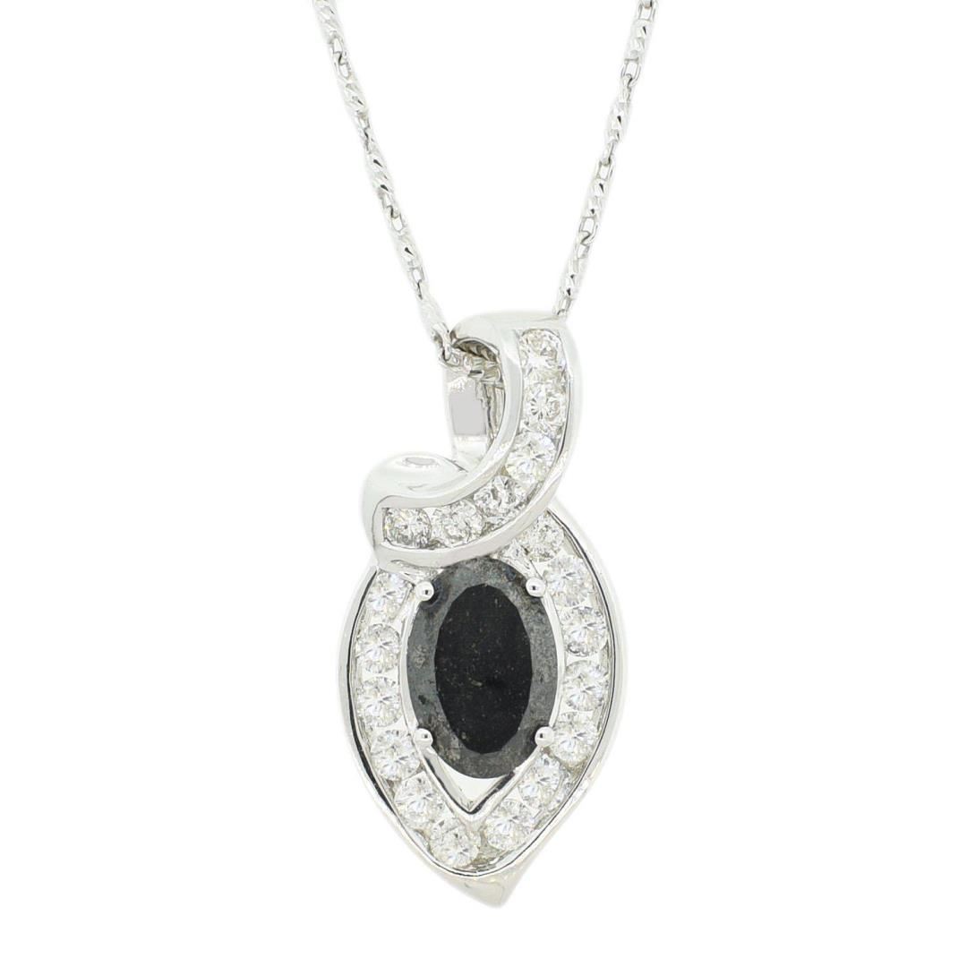 One electronically tested 14KT white gold ladies cast & assembled black and white diamond pendant with chain. Condition is new, good workmanship. The pendant features a black diamond set with a white diamond bezel completed by a white diamond bail. The pendant is supported by an eighteen inch length 14KT white gold designer style chain, terminating in a lobster claw clasp. Bright polish finish. Trademark is Orianne. Identified with markings of "14K". Containing: One prong set oval shaped cut diamond, measuring 11.00 x 7.50 x 5.35mm (depth est.), 25.00% GTCF approximate weight of 4.03ct. Indications of multiple laboratory enhancements. Graded in the setting. Clarity Déclassé Color Fancy Black Irradiated Depth 71.3% Table 62.7%. Nineteen channel set round brilliant cut diamonds, measuring 2.70 - 2.50 x 1.56mm (depth est.) approximate total weight of 19 Stones = 1.31ctw. Graded in the setting. SI-1 to I-1 Color G - H Total Weight of Diamonds 5.34ct. Total Weight of Pendant With Chain 10.24 gm