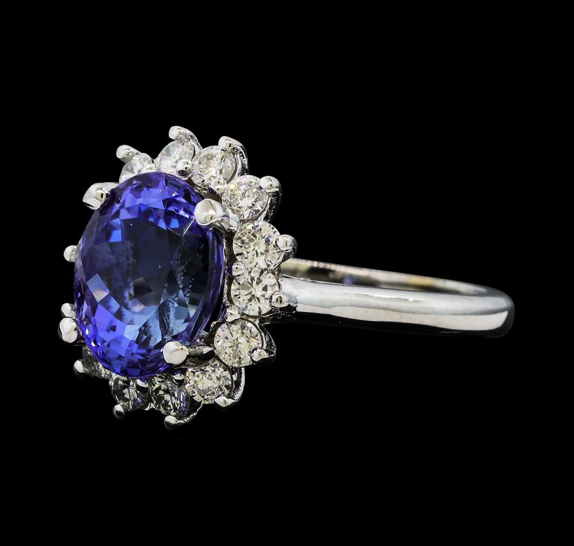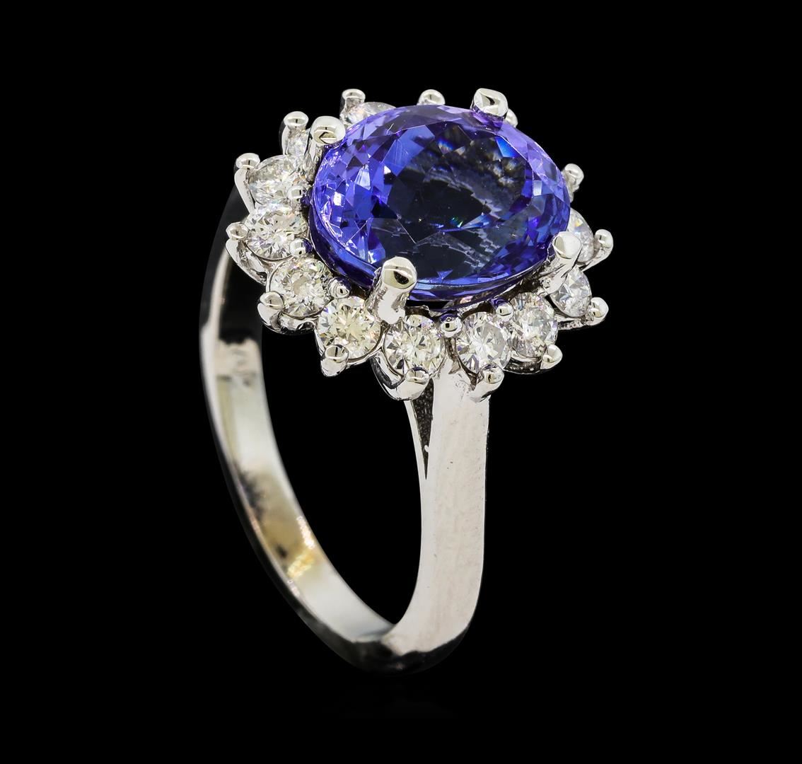 One electronically tested 14KT white gold lady's cast fashion ring with a basket halo with a bright polish finish. The featured lady's ring has a shank measuring 2.15 millimeters wide. Identified with markings of '14K'. Condition is new, good workmanship. Containing: One prong set oval modified brilliant cut natural tanzanite, measuring 10.35 x 8.45 x 6.41mm, (depth est.) approximate weight of 4.03ct., clarity is eye clean, medium, moderately strong, violet color, (GIA V 5/4), cut is very good. Transmitting light with no distortion, transparent. Colored gemstones are presumed to have been subjected to commonly used enhancement processes. Graded in the setting. Fourteen prong set round brilliant cut diamonds, measuring 2.50 - 2.40 x 1.47mm (depth est.) approximate total weight of 14 Stones = 0.75ct. Graded in the setting. Clarity SI-1 to I-1. Color: G - H Cut Good. Total Weight of Colored Stones 4.03ct.. Total Weight of Diamonds 0.75ct.. Total Weight of Ring 5.70gm. GAS Appraised at $8,510.00.