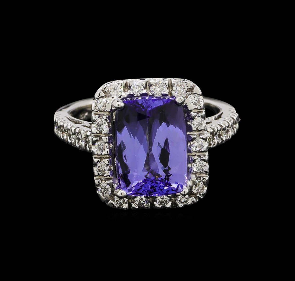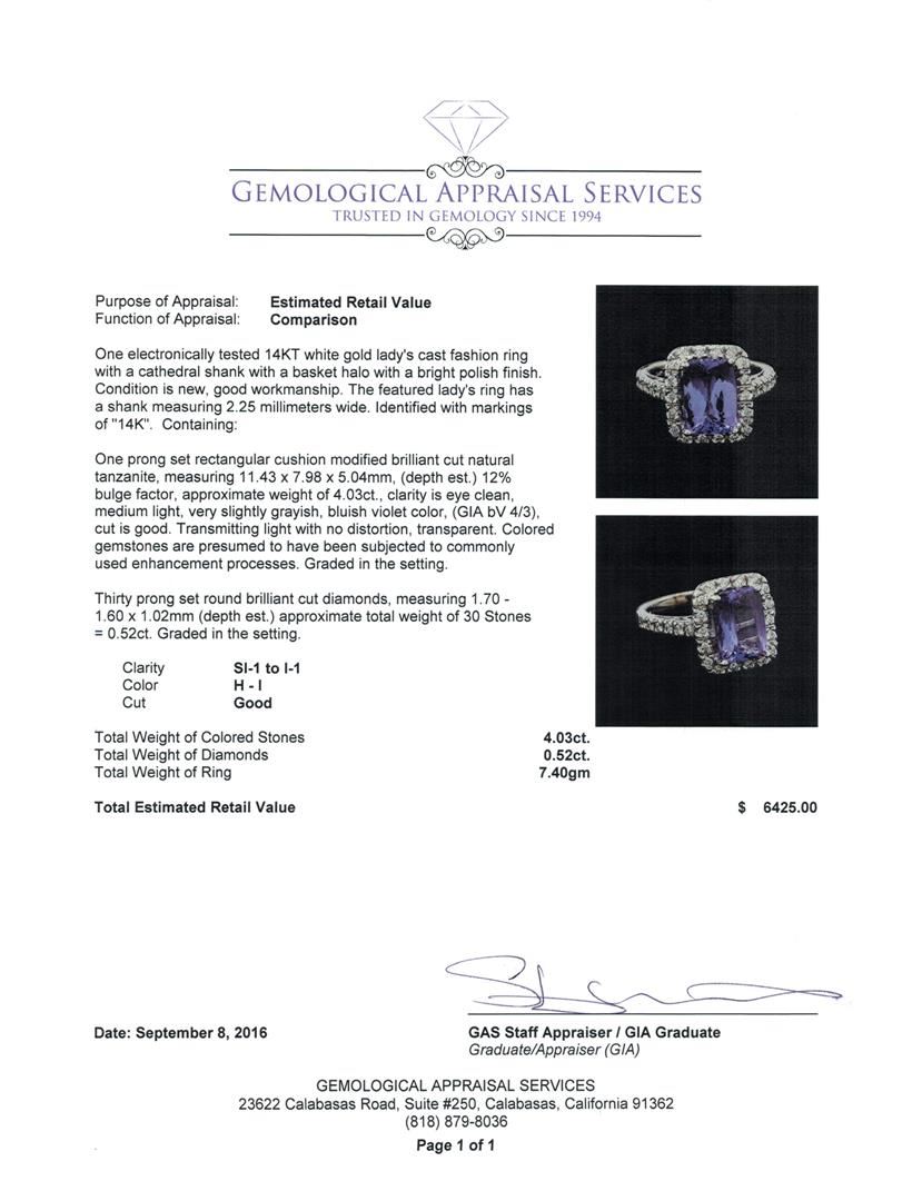 One electronically tested 14KT white gold lady's cast fashion ring with a cathedral shank with a basket halo with a bright polish finish. The featured lady's ring has a shank measuring 2.25 millimeters wide. Identified with markings of '14K'. Condition is new, good workmanship. Containing: One prong set rectangular cushion modified brilliant cut natural tanzanite, measuring 11.43 x 7.98 x 5.04mm, (depth est.) 12%. bulge factor, approximate weight of 4.03ct., clarity is eye clean, medium light, very slightly grayish, bluish violet color, (GIA bV 4/3), cut is good. Transmitting light with no distortion, transparent. Colored gemstones are presumed to have been subjected to commonly used enhancement processes. Graded in the setting. Thirty prong set round brilliant cut diamonds, measuring 1.70 - 1.60 x 1.02mm (depth est.) approximate total weight of 30 Stones = 0.52ct. Graded in the setting. Clarity SI-1 to I-1. Color: H - I Cut Good. Total Weight of Colored Stones 4.03ct.. Total Weight of Diamonds 0.52ct.. Total Weight of Ring 7.40gm GAS Appraised at $6,425.00.