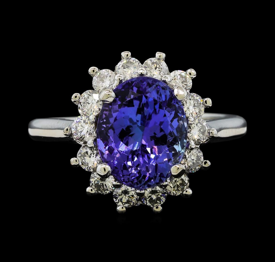 One electronically tested 14KT white gold lady's cast fashion ring with a basket halo with a bright polish finish. The featured lady's ring has a shank measuring 2.15 millimeters wide. Identified with markings of '14K'. Condition is new, good workmanship. Containing: One prong set oval modified brilliant cut natural tanzanite, measuring 10.35 x 8.45 x 6.41mm, (depth est.) approximate weight of 4.03ct., clarity is eye clean, medium, moderately strong, violet color, (GIA V 5/4), cut is very good. Transmitting light with no distortion, transparent. Colored gemstones are presumed to have been subjected to commonly used enhancement processes. Graded in the setting. Fourteen prong set round brilliant cut diamonds, measuring 2.50 - 2.40 x 1.47mm (depth est.) approximate total weight of 14 Stones = 0.75ct. Graded in the setting. Clarity SI-1 to I-1. Color: G - H Cut Good. Total Weight of Colored Stones 4.03ct.. Total Weight of Diamonds 0.75ct.. Total Weight of Ring 5.70gm. GAS Appraised at $8,510.00.