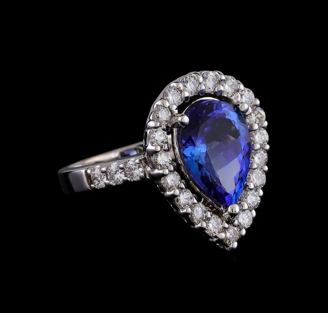 One electronically tested 14KT white gold lady's cast fashion ring with a basket halo with a bright polish finish. The featured lady's has a shank measuring 2.70 millimeters in width. Identified with markings of "14K". Condition is new, good workmanship. Containing: One prong set pear modified brilliant cut natural tanzanite, measuring 12.20 x 8.67 x 5.53mm, (depth est.) approximate weight of 4.03ct., clarity is eye clean, medium, very slightly grayish, bluish violet color, (GIA bV 5/3), cut is very good. Transmitting light with no distortion, transparent. Colored gemstones are presumed to have been subjected to commonly used enhancement processes. Graded in the setting. Twenty-Five prong set round brilliant cut diamonds, measuring 2.30 - 2.20 x 1.37mm (depth est.) approximate total weight of 25 Stones = 1.04ct. Graded in the setting. Clarity: VS-2 to SI-2. Color: H - I. Cut Good. Total Weight of Colored Stones 4.03ct. Total Weight of Diamonds 1.04ct. Total Weight of Ring 7.20gm.