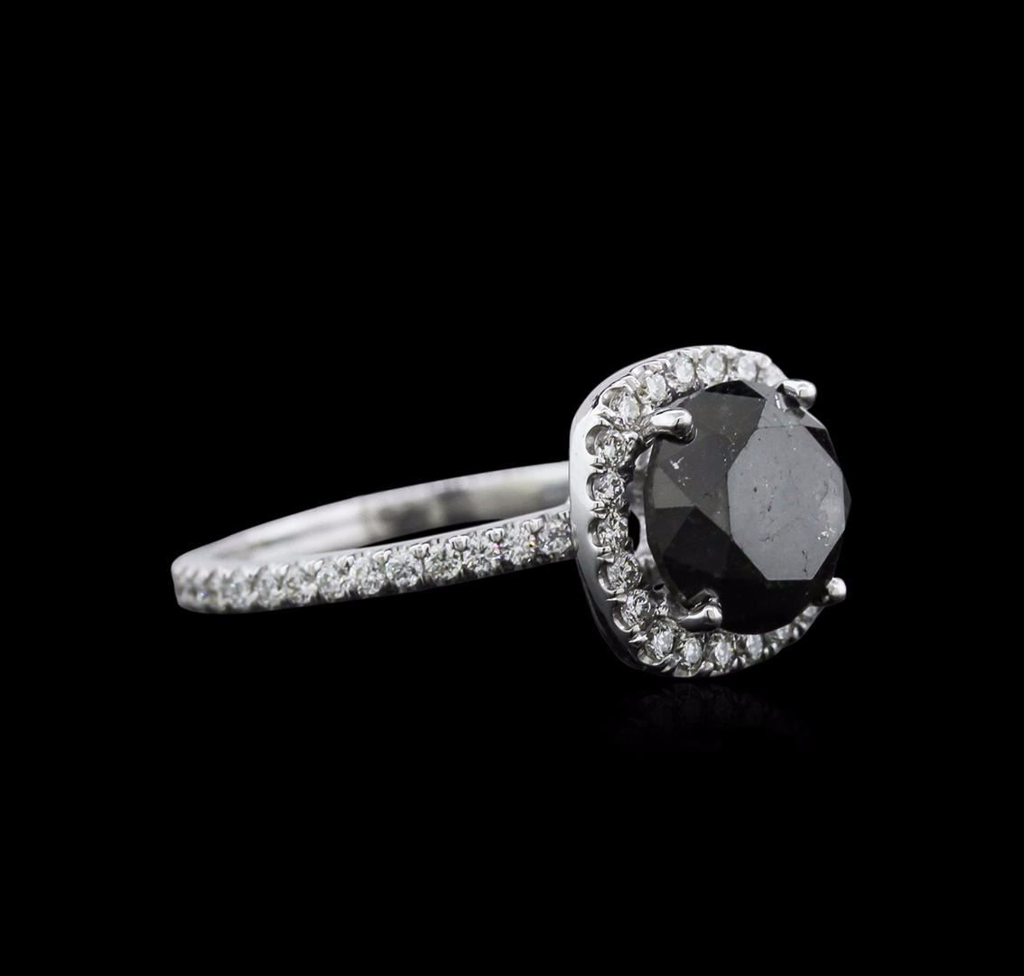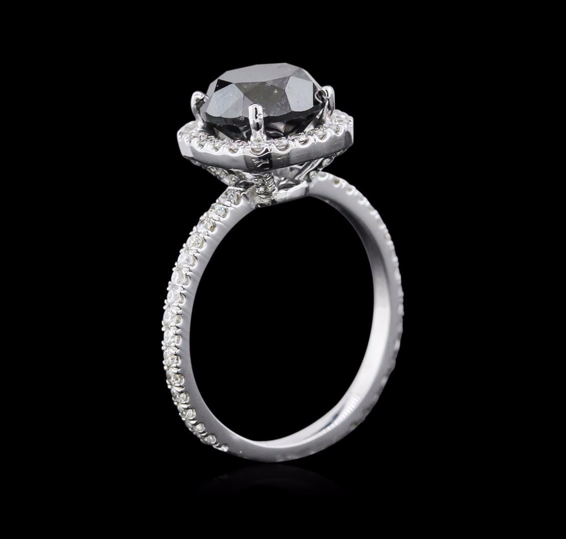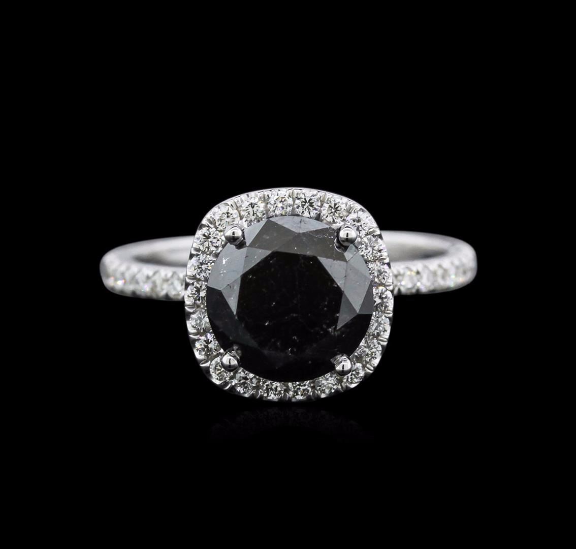 One electronically tested 18KT white gold ladies cast diamond engagement ring with a bright polish finish. Identified with markings of "18K". Condition is new. Containing: One prong set round brilliant cut diamond, measuring 9.50 - 9.50 x 6.28mm (depth est.) approximate weight of 3.46ct. color of fancy black, cut is Good. Seventy-Two prong set round brilliant cut diamonds, measuring 1.30 - 1.30 x 0.78mm (depth est.) approximate total weight of 72 Stones = 0.58ct. Clarity: SI-1 to SI-2. Color: H - I, Cut is Good. Diamonds are graded in the mounting, unless otherwise stated. Total Weight of Diamonds 4.03ct. Total Weight of Engagement Ring 3.80gm. GGL Appraised at $4,005.00.