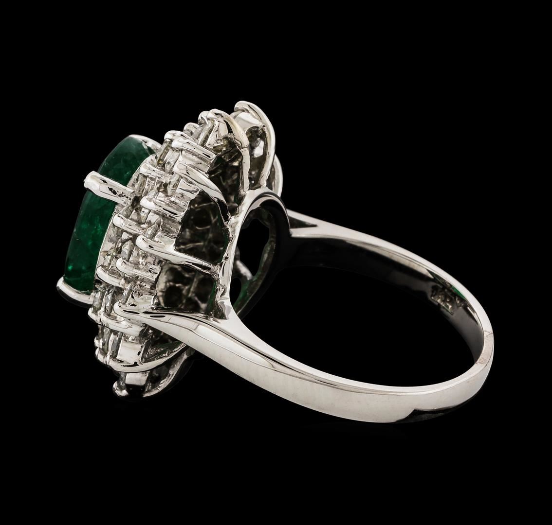 One electronically tested 14KT white gold lady's cast fashion ring with a staggered triple basket halo with a bright polish finish. The featured lady's ring has a shank measuring 2.56 millimeters wide. Identified with markings of 'K14'. Condition is new, good workmanship. Containing: One prong set oval modified mixed cut natural emerald, measuring 11.70 x 9.00 x 6.15mm, (depth est.) 10%. bulge factor, approximate weight of 4.04ct., clarity is heavily included, medium dark, moderately strong, green color, (GIA G 6/4), cut is good. Transmitting light somewhat diffusely, semi-transparent to translucent. Naturally occurring internal & external characteristics are present. Indications of oil residue. Colored gemstones are presumed to have been subjected to commonly used enhancement processes. Graded in the setting. Thirty-Six prong set round brilliant cut diamonds, measuring 2.50 - 2.40 x 1.52mm (depth est.) approximate total weight of 36 Stones = 1.98ct. Graded in the setting. Clarity SI-1 to I-1. Color: G - H Cut Good. Total Weight of Colored Stones 4.04ct.. Total Weight of Diamonds 1.98ct.. Total Weight of Ring 7.80gm. GAS Appraised at $9,410.00.