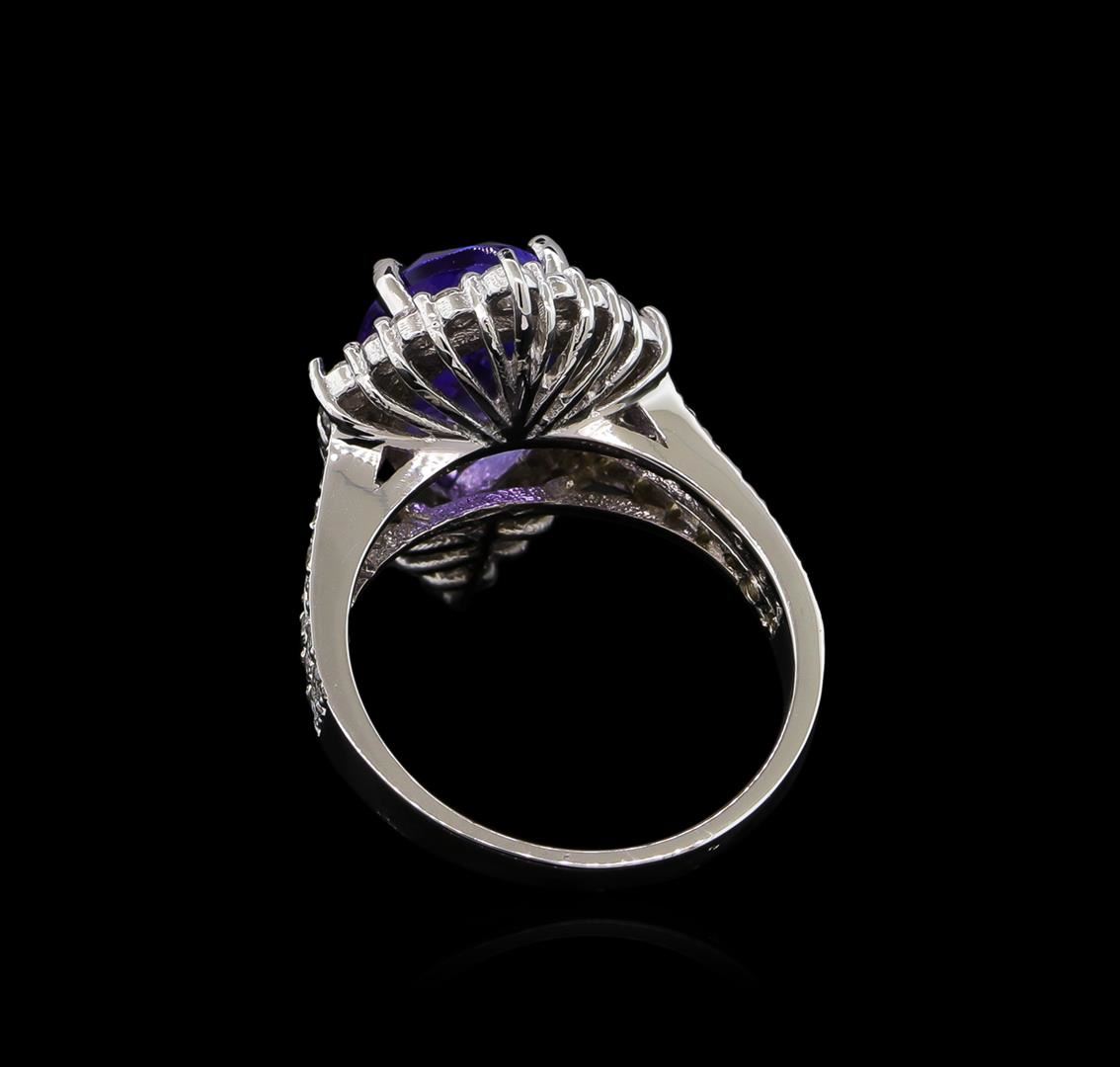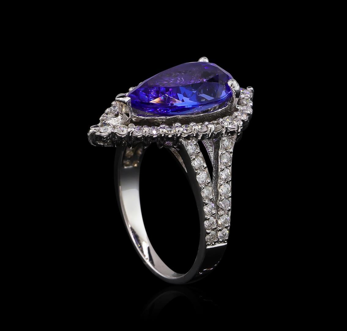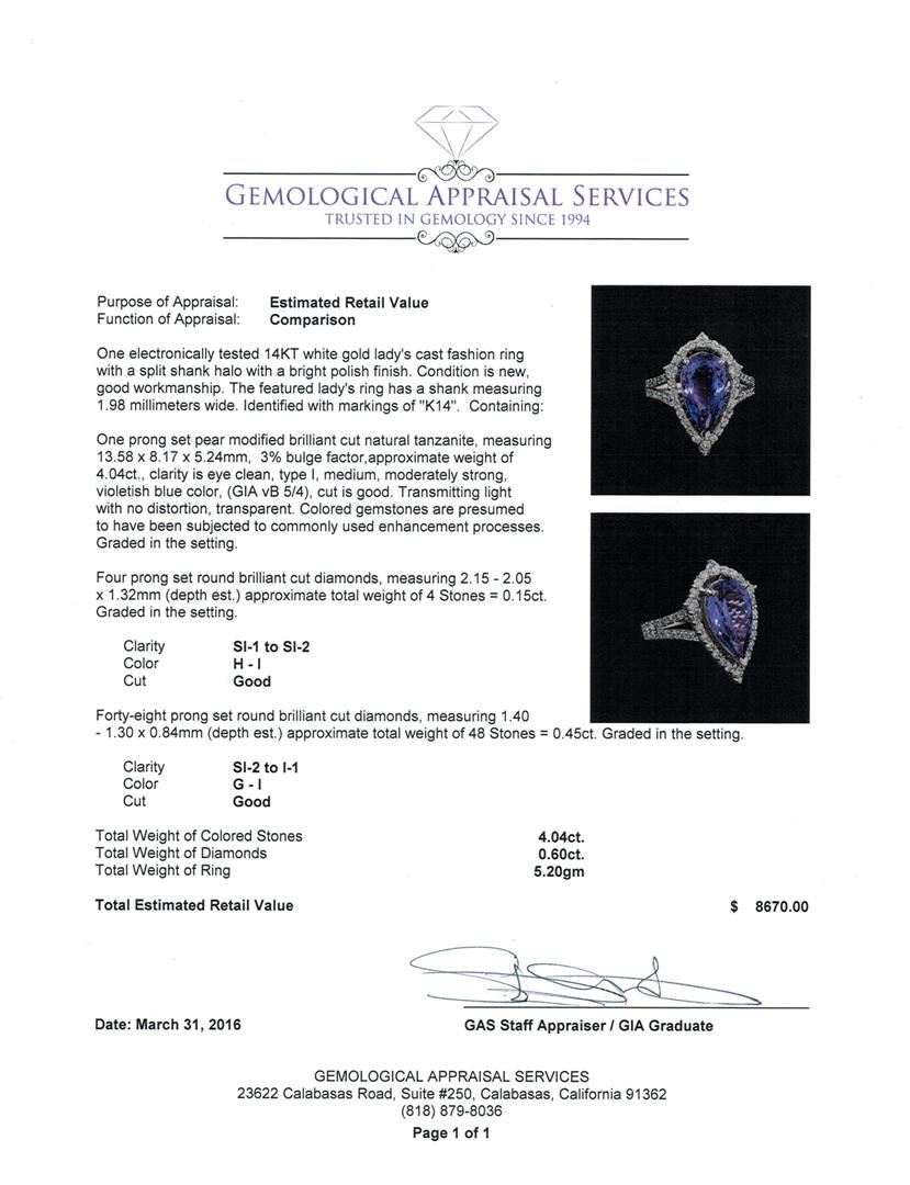 One electronically tested 14KT white gold lady's cast fashion ring with a split shank halo with a bright polish finish. The featured lady's ring has a shank measuring 1.98 millimeters wide. Identified with markings of "K14". Condition is new, good workmanship. Containing: One prong set pear modified brilliant cut natural tanzanite, measuring 13.58 x 8.17 x 5.24mm, 3%. bulge factor, approximate weight of 4.04ct., clarity is eye clean, type I, medium, moderately strong, violetish blue color, (GIA vB 5/4), cut is good. Transmitting light with no distortion, transparent. Colored gemstones are presumed to have been subjected to commonly used enhancement processes. Graded in the setting. Four prong set round brilliant cut diamonds, measuring 2.15 - 2.05 x 1.32mm (depth est.) approximate total weight of 4 Stones = 0.15ct. Graded in the setting. Clarity: SI-1 to SI-2. Color: H - I. Cut Good Forty-Eight prong set round brilliant cut diamonds, measuring 1.40 - 1.30 x 0.84mm (depth est.) approximate total weight of 48 Stones = 0.45ct. Graded in the setting. Clarity: SI-2 to I-1. Color: G - I. Cut Good. Total Weight of Colored Stones 4.04ct. Total Weight of Diamonds 0.60ct. Total Weight of Ring 5.20gm GAS Appraised.