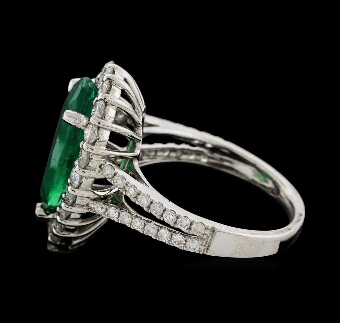 One electronically tested 14KT white gold lady's cast fashion ring with a split shank basket halo with a bright polish finish. The featured lady's ring has a shank measuring 2.25 millimeters wide. Identified with markings of '14K'. Condition is new, good workmanship. Containing: One prong set pear modified mixed cut natural emerald, measuring 15.00 x 9.02 x 4.56mm, (depth est.) 15%. bulge factor, approximate weight of 4.05ct., clarity is heavily included, medium, moderately strong, green color, (GIA G 5/4), cut is good. Transmitting light somewhat diffusely, semi-transparent to translucent. Naturally occurring internal & external characteristics are present. Indications of oil residue. Colored gemstones are presumed to have been subjected to commonly used enhancement processes. Graded in the setting. Twenty prong set round brilliant cut diamonds, measuring 2.35 - 2.25 x 1.43mm (depth est.) approximate total weight of 20 Stones = 0.92ct. Graded in the setting. Clarity SI-1 to I-1. Color: G - H Cut Good Thirty-Two prong set round brilliant cut diamonds, measuring 1.45 - 1.35 x 0.87mm (depth est.) approximate total weight of 32 Stones = 0.34ct. Graded in the setting. Clarity SI-1 to I-2. Color: G - I Cut Good. Total Weight of Colored Stones 4.05ct.. Total Weight of Diamonds 1.26ct.. Total Weight of Ring 5.40gm. GAS Appraised at $8,955.00.