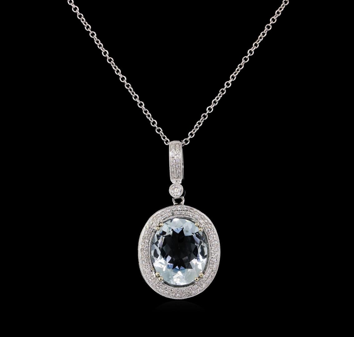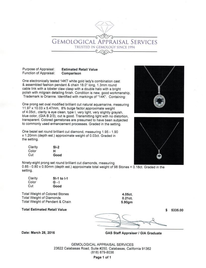 One electronically tested 14KT white gold lady's combination cast & assembled fashion pendant & chain 18.0" long, 1.3mm round cable link with a lobster claw clasp with a double halo with a bright polish with milgrain detailing finish. Trademark is Orianne. Identified with markings of "14K". Condition is new, good workmanship. Containing: One prong set oval modified brilliant cut natural aquamarine, measuring 11.97 x 10.03 x 5.47mm, 8%. bulge factor, approximate weight of 4.05ct., clarity is eye clean, type I, very light, very slightly grayish, blue color, (GIA B 2/3), cut is good. Transmitting light with no distortion, transparent. Colored gemstones are presumed to have been subjected to commonly used enhancement processes. Graded in the setting. One bezel set round brilliant cut diamond, measuring 1.95 - 1.90 x 1.20mm (depth est.) approximate weight of 0.03ct. Graded in the setting. Clarity: SI-2. Color: Good Ninety-Eight prong set round brilliant cut diamonds, measuring 0.85 - 0.80 x 0.50mm (depth est.) approximate total weight of 98 Stones = 0.18ct. Graded in the setting. Clarity: SI-1 to I-1. Color: G - I. Cut Good. Total Weight of Colored Stones 4.05ct. Total Weight of Diamonds 0.21ct. Total Weight of Pendant & Chain 5.90gm. GAS Appraised at $5,335.00.