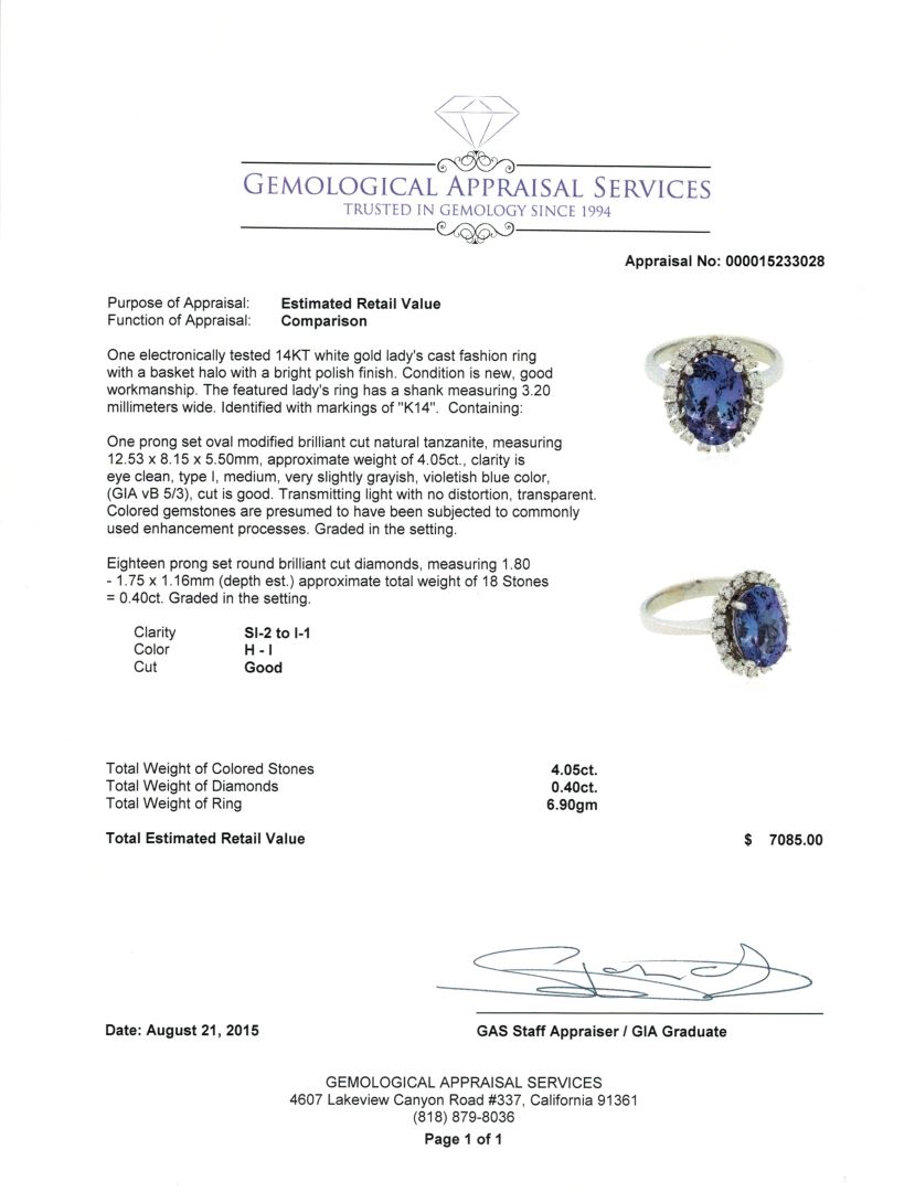 One electronically tested 14KT white gold lady's cast fashion ring with a basket halo with a bright polish finish. The featured lady's ring has a shank measuring 3.20 millimeters wide. Identified with markings of "K14". Condition is new, good workmanship. Containing: One prong set oval modified brilliant cut natural tanzanite, measuring 12.53 x 8.15 x 5.50mm, approximate weight of 4.05ct., clarity is eye clean, type I, medium, very slightly grayish, violetish blue color, (GIA vB 5/3), cut is good. Transmitting light with no distortion, transparent. Colored gemstones are presumed to have been subjected to commonly used enhancement processes. Graded in the setting. Eighteen prong set round brilliant cut diamonds, measuring 1.80 - 1.75 x 1.16mm (depth est.) approximate total weight of 18 Stones = 0.40ct. Graded in the setting. Clarity: SI-2 to I-1. Color: H - I. Cut Good. Total Weight of Colored Stones 4.05ct. Total Weight of Diamonds 0.40ct. Total Weight of Ring 6.90gm. GAS Appraised at $7,085.00.