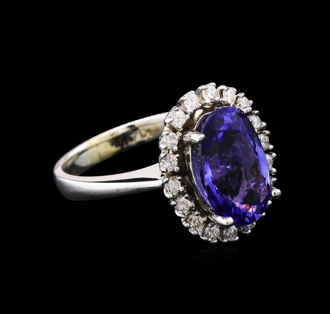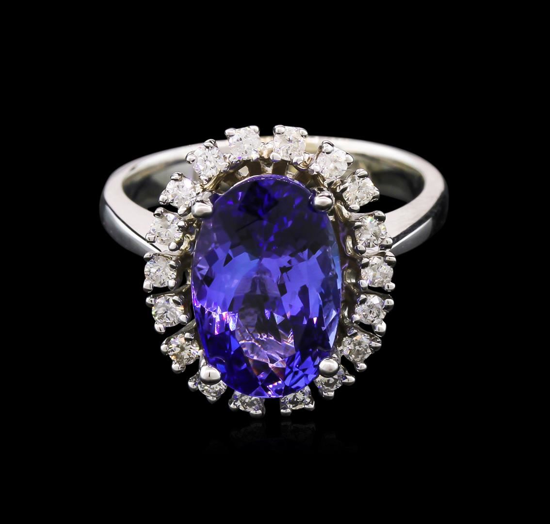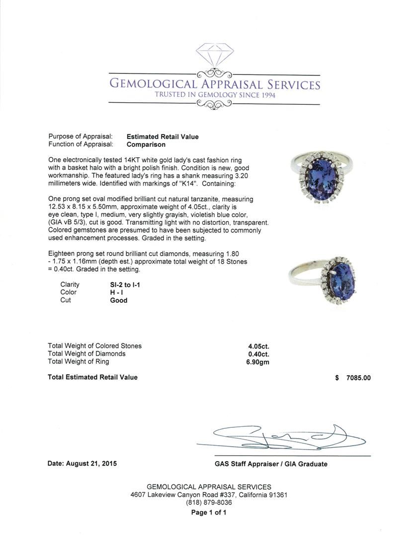 One electronically tested 14KT white gold lady's cast fashion ring with a basket halo with a bright polish finish. The featured lady's ring has a shank measuring 3.20 millimeters wide. Identified with markings of "K14". Condition is new, good workmanship. Containing: One prong set oval modified brilliant cut natural tanzanite, measuring 12.53 x 8.15 x 5.50mm, approximate weight of 4.05ct., clarity is eye clean, type I, medium, very slightly grayish, violetish blue color, (GIA vB 5/3), cut is good. Transmitting light with no distortion, transparent. Colored gemstones are presumed to have been subjected to commonly used enhancement processes. Graded in the setting. Eighteen prong set round brilliant cut diamonds, measuring 1.80 - 1.75 x 1.16mm (depth est.) approximate total weight of 18 Stones = 0.40ct. Graded in the setting. Clarity: SI-2 to I-1. Color: H - I. Cut Good. Total Weight of Colored Stones 4.05ct. Total Weight of Diamonds 0.40ct. Total Weight of Ring 6.90gm. GAS Appraised at $7,085.00.