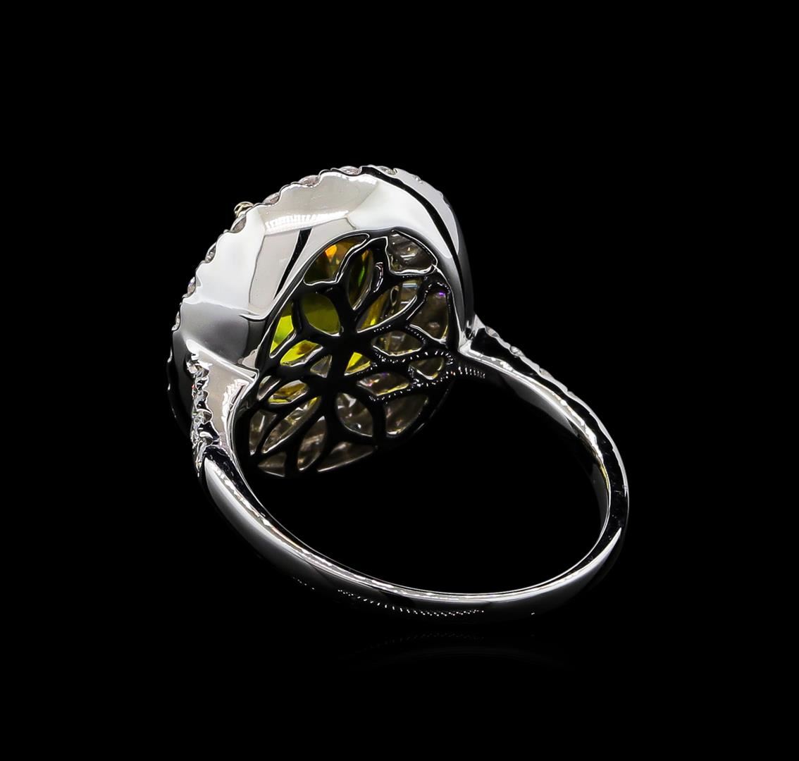 One polished, stamped, and tested 18KT white gold ring with a bright polish finish. The ring is mounted with: 1 genuine yellow sapphire center stone weighing 4.06ct, and 44 genuine baguette diamonds weighing 0.59ct, and 34 genuine round diamonds weighing 0.32ct. This item weighs 5.70 grams, condition is new, excellent workmanship. MAIN GEMSTONE: Species: Natural Corundum. Variety: Fancy color sapphire. Shape: Oval. Cutting Style: Brilliant cut crown; step cut pavilion. Measurements: 10.83 x 7.82mm. Weight: 4.06ct. Color: Yellow. Cut Grade: Very good. Refractive Index: 1.762 - 1.770 DR. Birefringence: 0.008 - 0.010. Hardness: 9. ADJACENT GEMSTONES ON RING: Identity: Natural diamond. Cut: Baguette/round brilliant. Quantity: 78 diamonds. Measurements: 1.5mm (44 baguette); 1.4-1.6mm (34 round). Total Weight: 0.91ct. Color Grade: E - F. Clarity Grade: VS2 - SI1. Refractive Index: 2.418. Hardness: 10. AIGL Appraised at $11,475.00.