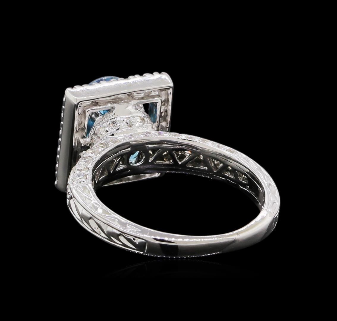 One electronically tested 18KT white gold ladies cast blue zircon and diamond ring. The featured blue zircon is set within a diamond bezel supported by diamond set decorative shoulders, completed by a two millimeter wide band. Bright and patterned finish with milgrain detailing. Identified with markings of '18K'. Condition is new, good workmanship. Containing: One prong set oval mixed cut natural blue zircon, measuring 9.50 x 7.00 x 5.90mm, 5%. bulge factor, approximate weight of 4.07ct., clarity is eye clean, type I, medium dark, moderately strong, very strongly greenish blue color, (GIA vstgB 6/4), cut is good. Transmitting light with no distortion, transparent. Graded in the setting. Fifty prong set round brilliant cut diamonds, measuring 1.50 - 1.50 x 0.90mm (depth est.) approximate total weight of 50 Stones = 0.67ct. The clarity grade reflects the entire range of clarity for this group. Graded in the setting. Clarity SI-1 to I-2. Color: F - H Twenty-One prong set round brilliant cut diamonds, measuring 1.20 - 1.00 x 0.66mm (depth est.) approximate total weight of 21 Stones = 0.14ct. Graded in the setting. Clarity SI-2 to I-2. Color: G - I. Total Weight of Colored Stones 4.07ct.. Total Weight of Diamonds 0.81ct.. Total Weight of Ring 6.74gm. AIG Appraised at $5,735.00.