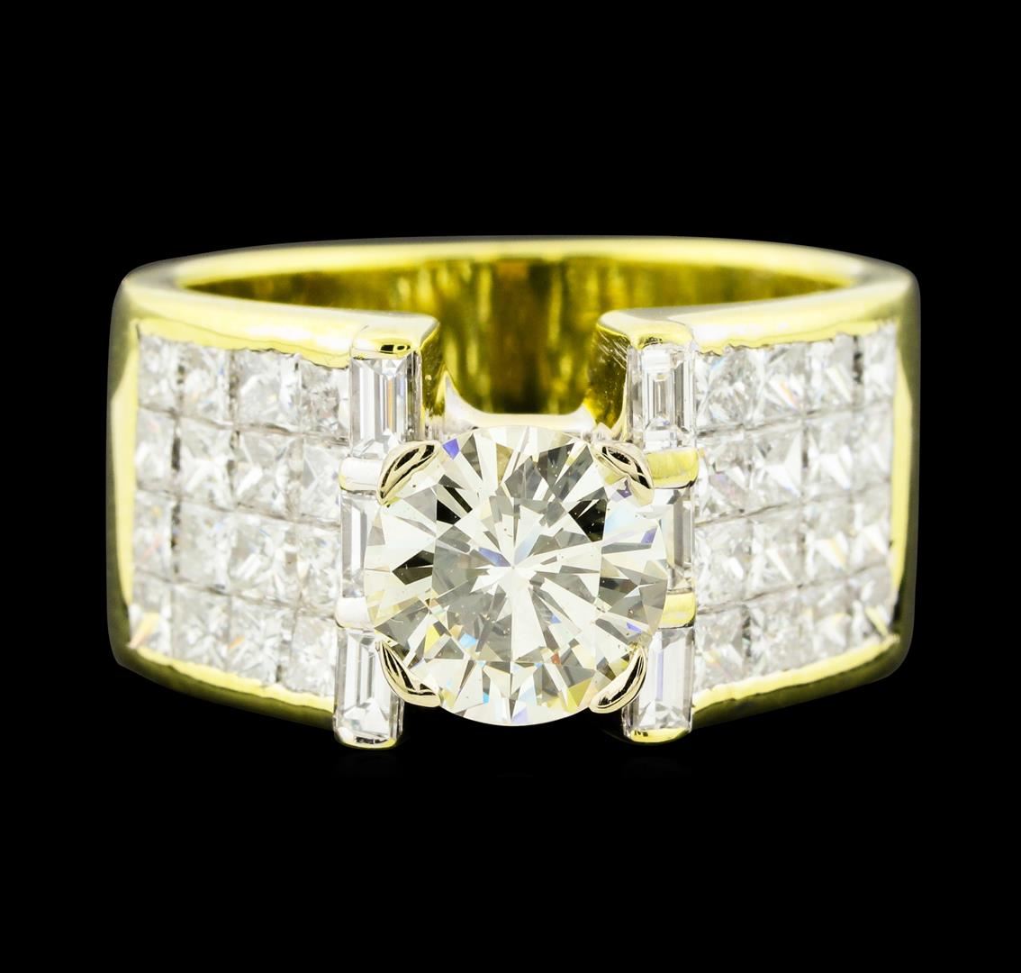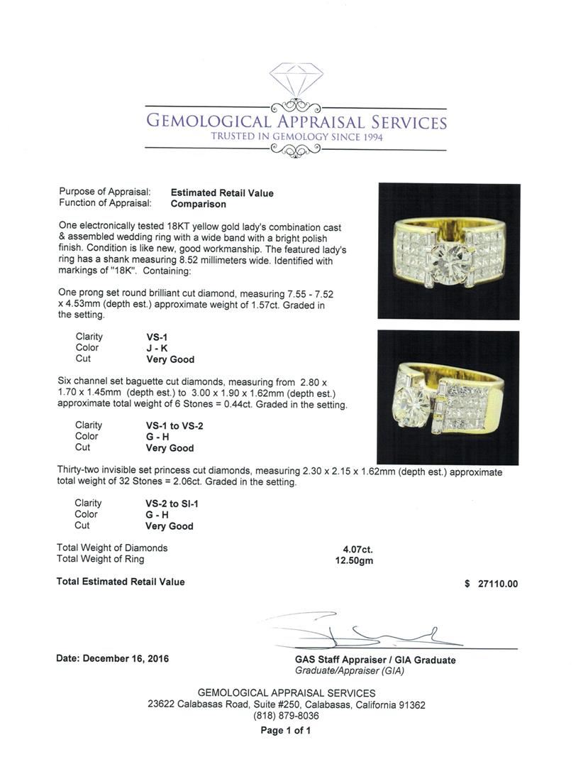 One electronically tested 18KT yellow gold lady's combination cast & assembled wedding ring with a wide band with a bright polish finish. The featured lady's ring has a shank measuring 8.52 millimeters wide. Identified with markings of '18K'. Condition is like new, good workmanship. Containing: One prong set round brilliant cut diamond, measuring 7.55 - 7.52 x 4.53mm (depth est.) approximate weight of 1.57ct. Graded in the setting. Clarity VS-1. Color: J - K Cut Very Good Six channel set baguette cut diamonds, measuring from 2.80 x 1.70 x 1.45mm (depth est.) to 3.00 x 1.90 x 1.62mm (depth est.) approximate total weight of 6 Stones = 0.44ct. Graded in the setting. Clarity VS-1 to VS-2. Color: G - H Cut Very Good Thirty-Two invisible set princess cut diamonds, measuring 2.30 x 2.15 x 1.62mm (depth est.) approximate total weight of 32 Stones = 2.06ct. Graded in the setting. Clarity VS-2 to SI-1. Color: G - H Cut Very Good. Total Weight of Diamonds 4.07ct.. Total Weight of Ring 12.50gm. GAS Appraised at $27,110.00.