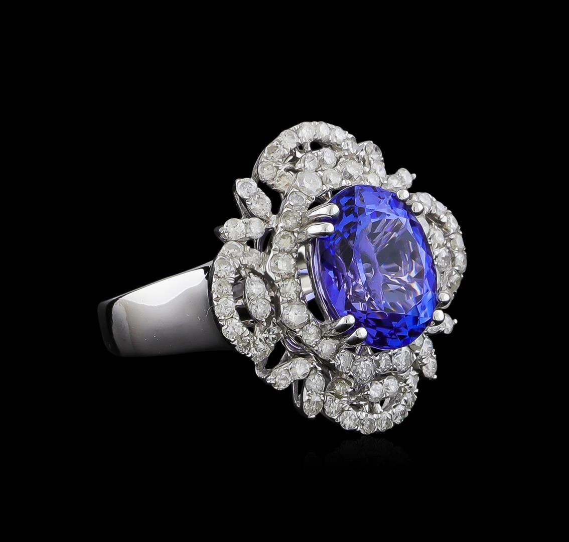 One electronically tested 14KT white gold ladies cast tanzanite and diamond ring with a bright polish finish. The featured tanzanite is set within a stylized diamond set gallery supported by tapering shoulders, completed by a two and one-half millimeter wide band. Trademark is Orianne. Identified with markings of "14K". Condition is new, good workmanship. Containing: One prong set oval mixed cut natural tanzanite, measuring 10.75 x 8.95 x 5.86mm, approximate weight of 4.07ct., clarity is eye clean, type I, medium dark, very slightly grayish, bluish violet color, (GIA bV 6/3), cut is good. Transmitting light with no distortion, transparent. Graded in the setting. Tanzanite is a very rare gemstone that is only found in the country of Tanzania. Originally discovered in 1967. Tiffany & Company, named the stone Tanzanite. It is found in the Usumburu Mountains that border the Umba Valley of northern Tanzania. Tanzanite occurs in gray, brown, violet, blue, reddish-purple, & green. The gem is interesting because of its exceptional pleochroism. Rotated in different directions a tanzanite will exhibit multiple changes of color. Tanzanite has a low tolerance to ultrasonic cleaning, and should not be cleaned using this method. Eighty-Four prong set round brilliant cut diamonds approximate total weight of 84 Stones = 0.99ct. Graded in the setting. Clarity: I-1 to I-2. Color: G - I. Total Weight of Colored Stones 4.07ct. Total Weight of Diamonds 0.99ct. Total Weight of Ring 5.29gm. AIG Appraised at $12,145.00.