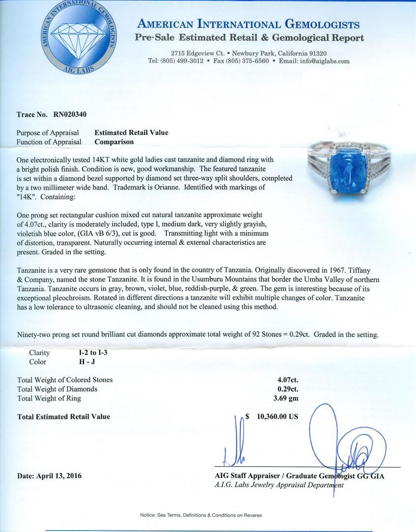 One electronically tested 14KT white gold ladies cast tanzanite and diamond ring with a bright polish finish. The featured tanzanite is set within a diamond bezel supported by diamond set three-way split shoulders, completed by a two millimeter wide band. Trademark is Orianne. Identified with markings of "14K". Condition is new, good workmanship. Containing: One prong set rectangular cushion mixed cut natural tanzanite approximate weight of 4.07ct., clarity is moderately included, type I, medium dark, very slightly grayish, violetish blue color, (GIA vB 6/3), cut is good. Transmitting light with a minimum of distortion, transparent. Naturally occurring internal & external characteristics are present. Graded in the setting. Tanzanite is a very rare gemstone that is only found in the country of Tanzania. Originally discovered in 1967. Tiffany & Company, named the stone Tanzanite. It is found in the Usumburu Mountains that border the Umba Valley of northern Tanzania. Tanzanite occurs in gray, brown, violet, blue, reddish-purple, & green. The gem is interesting because of its exceptional pleochroism. Rotated in different directions a tanzanite will exhibit multiple changes of color. Tanzanite has a low tolerance to ultrasonic cleaning, and should not be cleaned using this method. Ninety-Two prong set round brilliant cut diamonds approximate total weight of 92 Stones = 0.29ct. Graded in the setting. Clarity: I-2 to I-3. Color: H - J. Total Weight of Colored Stones 4.07ct. Total Weight of Diamonds 0.29ct. Total Weight of Ring 3.69gm. AIG Appraised at $10,360.00.