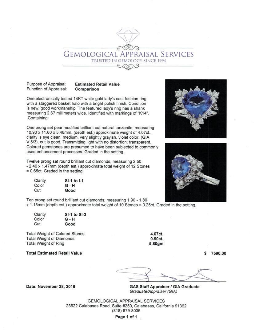 One electronically tested 14KT white gold lady's cast fashion ring with a staggered basket halo with a bright polish finish. The featured lady's ring has a shank measuring 2.67 millimeters wide. Identified with markings of 'K14'. Condition is new, good workmanship. Containing: One prong set pear modified brilliant cut natural tanzanite, measuring 10.90 x 11.60 x 5.46mm, (depth est.) approximate weight of 4.07ct., clarity is eye clean, medium, very slightly grayish, violet color, (GIA V 5/3), cut is good. Transmitting light with no distortion, transparent. Colored gemstones are presumed to have been subjected to commonly used enhancement processes. Graded in the setting. Twelve prong set round brilliant cut diamonds, measuring 2.50 - 2.40 x 1.47mm (depth est.) approximate total weight of 12 Stones = 0.65ct. Graded in the setting. Clarity SI-1 to I-1. Color: G - H Cut Good Ten prong set round brilliant cut diamonds, measuring 1.90 - 1.80 x 1.15mm (depth est.) approximate total weight of 10 Stones = 0.25ct. Graded in the setting. Clarity SI-1 to SI-3. Color: G - H Cut Good. Total Weight of Colored Stones 4.07ct.. Total Weight of Diamonds 0.90ct.. Total Weight of Ring 5.80gm. GAS Appraised at $7,590.00.