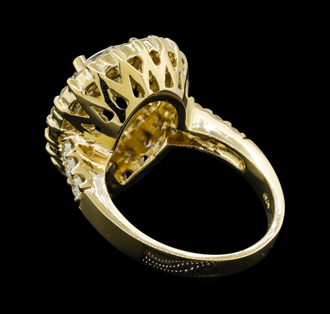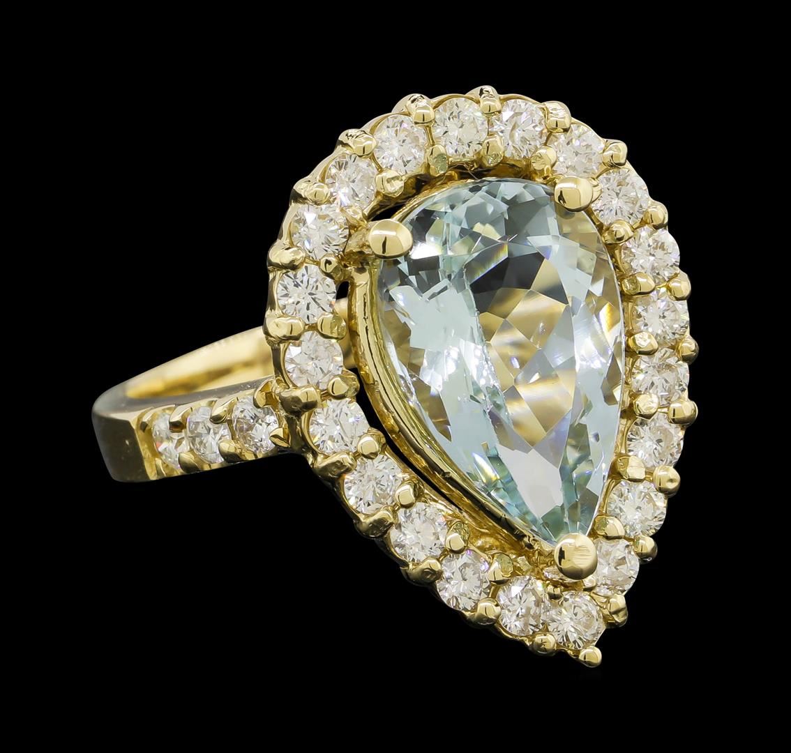 One electronically tested 14KT yellow gold lady's cast fashion ring with a basket halo with a bright polish finish. The featured lady's ring has a shank measuring 2.68 millimeters wide. Identified with markings of 'K14'. Condition is new, good workmanship. Containing: One prong set pear modified brilliant cut natural aquamarine, measuring 13.85 x 9.01 x 6.39mm, (depth est.) approximate weight of 4.08ct., clarity is eye clean, medium light, moderately strong, very slightly greenish blue color, (GIA vslgB 4/4), cut is very good. Transmitting light with no distortion, transparent. Colored gemstones are presumed to have been subjected to commonly used enhancement processes. Graded in the setting. Twenty-Seven prong set round brilliant cut diamonds, measuring 2.20 - 2.15 x 1.35mm (depth est.) approximate total weight of 27 Stones = 1.06ct. Graded in the setting. Clarity SI-1 to I-1. Color: G - H Cut Good. Total Weight of Colored Stones 4.08ct.. Total Weight of Diamonds 1.06ct.. Total Weight of Ring 8.40gm. GAS Appraised at $11,735.00.