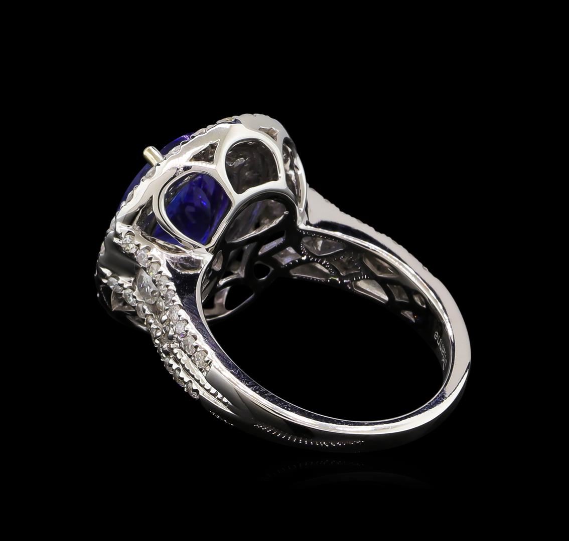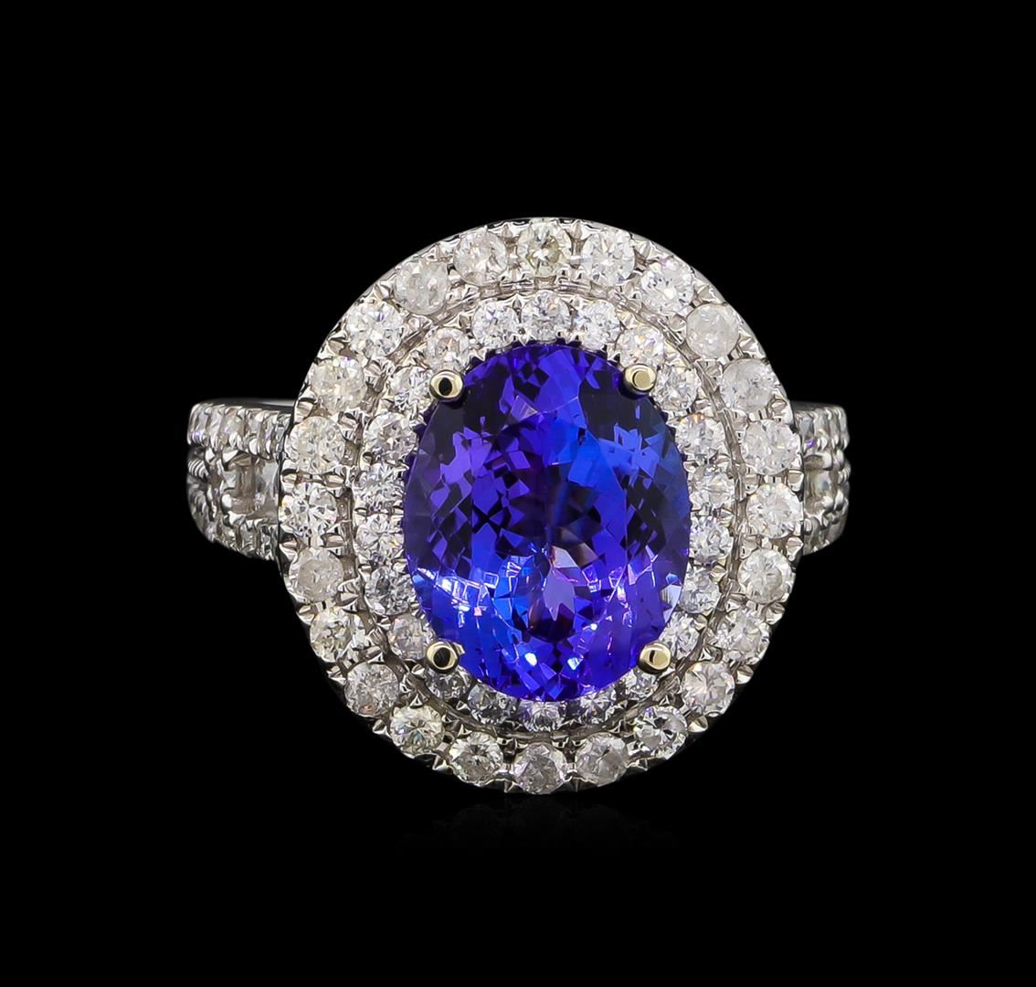 One electronically tested 14KT white gold lady's cast fashion ring with a basket double halo with a bright polish finish. The featured lady's ring has a shank measuring 2.22 millimeters wide. Trademark is Orianne. Identified with markings of "14K". Condition is new, good workmanship. Containing: One prong set oval modified brilliant cut natural tanzanite, measuring 11.20 x 9.00 x 5.75mm, approximate weight of 4.08ct., clarity is eye clean, type I, medium dark, moderately strong, violetish blue color, (GIA vB 6/4), cut is very good. Transmitting light with no distortion, transparent. Colored gemstones are presumed to have been subjected to commonly used enhancement processes. Graded in the setting. Four channel set round brilliant cut diamonds, measuring 2.70 - 2.60 x 1.67mm (depth est.) approximate total weight of 4 Stones = 0.29ct. Graded in the setting. Clarity: I-1 to I-2. Color: G - Good Twenty-Six prong set round brilliant cut diamonds, measuring 1.90 - 1.80 x 1.15mm (depth est.) approximate total weight of 26 Stones = 0.62ct. Graded in the setting. Clarity: I-1 to I-2. Color: G - Good Twenty-Two prong set round brilliant cut diamonds, measuring 1.60 - 1.50 x 0.93mm (depth est.) approximate total weight of 22 Stones = 0.30ct. Graded in the setting. Clarity: SI-2 to I-1. Color: H - I. Cut Good Forty prong set round brilliant cut diamonds, measuring 1.30 - 1.20 x 0.75mm (depth est.) approximate total weight of 40 Stones = 0.28ct. Graded in the setting. Clarity: I-1 to I-2. Color: G - Good. Total Weight of Colored Stones 4.08ct. Total Weight of Diamonds 1.49ct. Total Weight of Ring 8.00gm. GAS Appraised at $11,310.00.