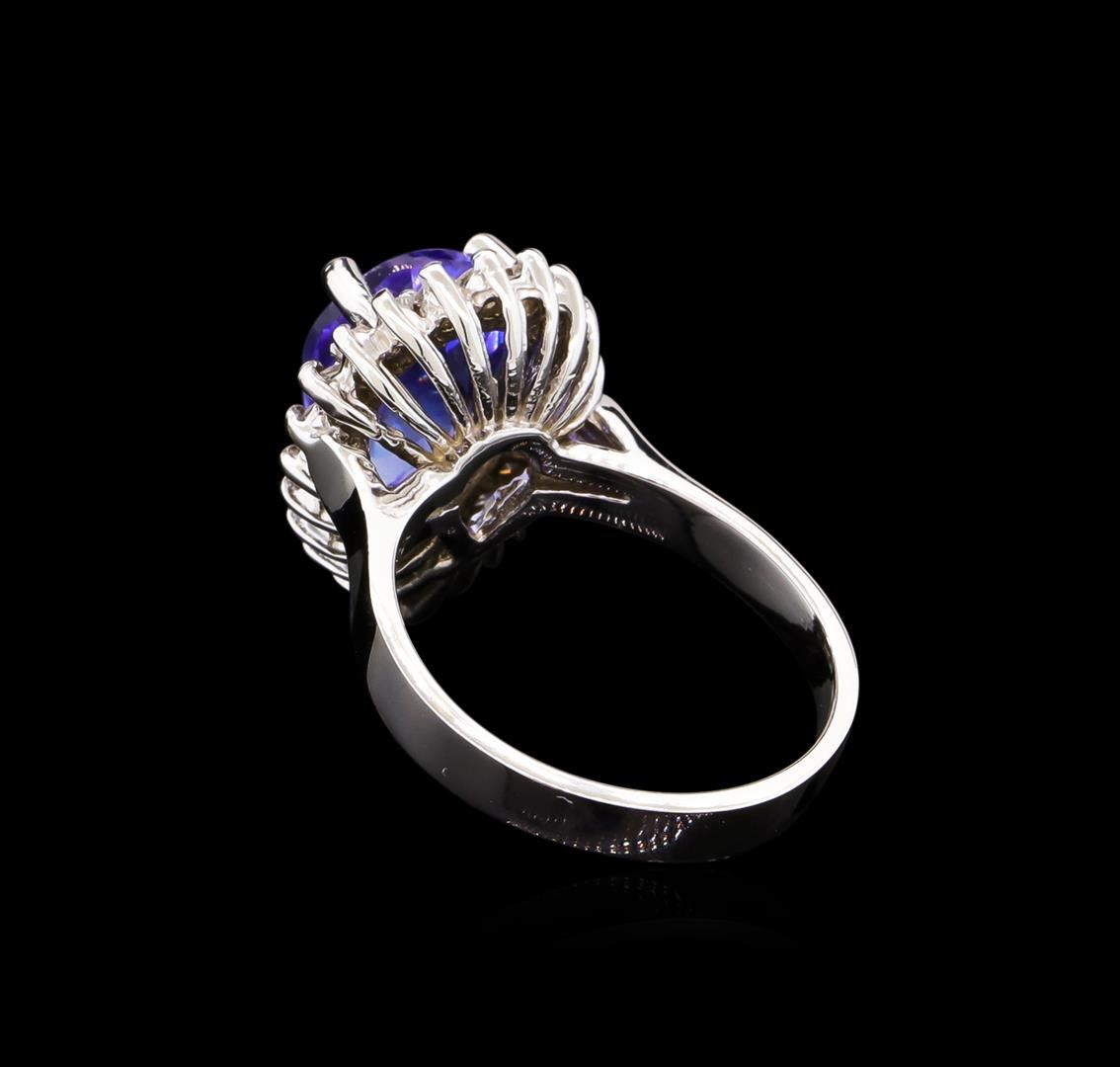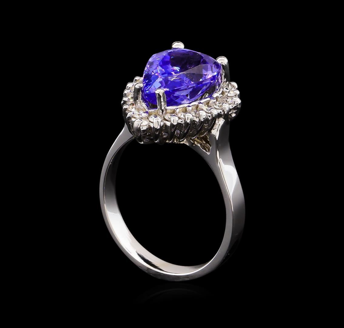One electronically tested 14KT white gold lady's cast fashion ring with a basket halo with a bright polish finish. The featured lady's ring has a shank measuring 2.80 millimeters wide. Identified with markings of "14K". Condition is new, good workmanship. Containing: One prong set pear modified brilliant cut natural tanzanite, measuring 12.65 x 8.43 x 6.00mm, approximate weight of 4.08ct., clarity is eye clean, type I, medium, moderately strong, violetish blue color, (GIA vB 5/4), cut is very good. Transmitting light with no distortion, transparent. Colored gemstones are presumed to have been subjected to commonly used enhancement processes. Graded in the setting. Twenty-Two prong set round brilliant cut diamonds, measuring 1.70 - 1.65 x 1.04mm (depth est.) approximate total weight of 22 Stones = 0.40ct. Graded in the setting. Clarity: SI-1 to SI-2. Color: H - I. Cut Good. Total Weight of Colored Stones 4.08ct. Total Weight of Diamonds 0.40ct. Total Weight of Ring 6.00gm. GAS Appraised at $8,345.00.