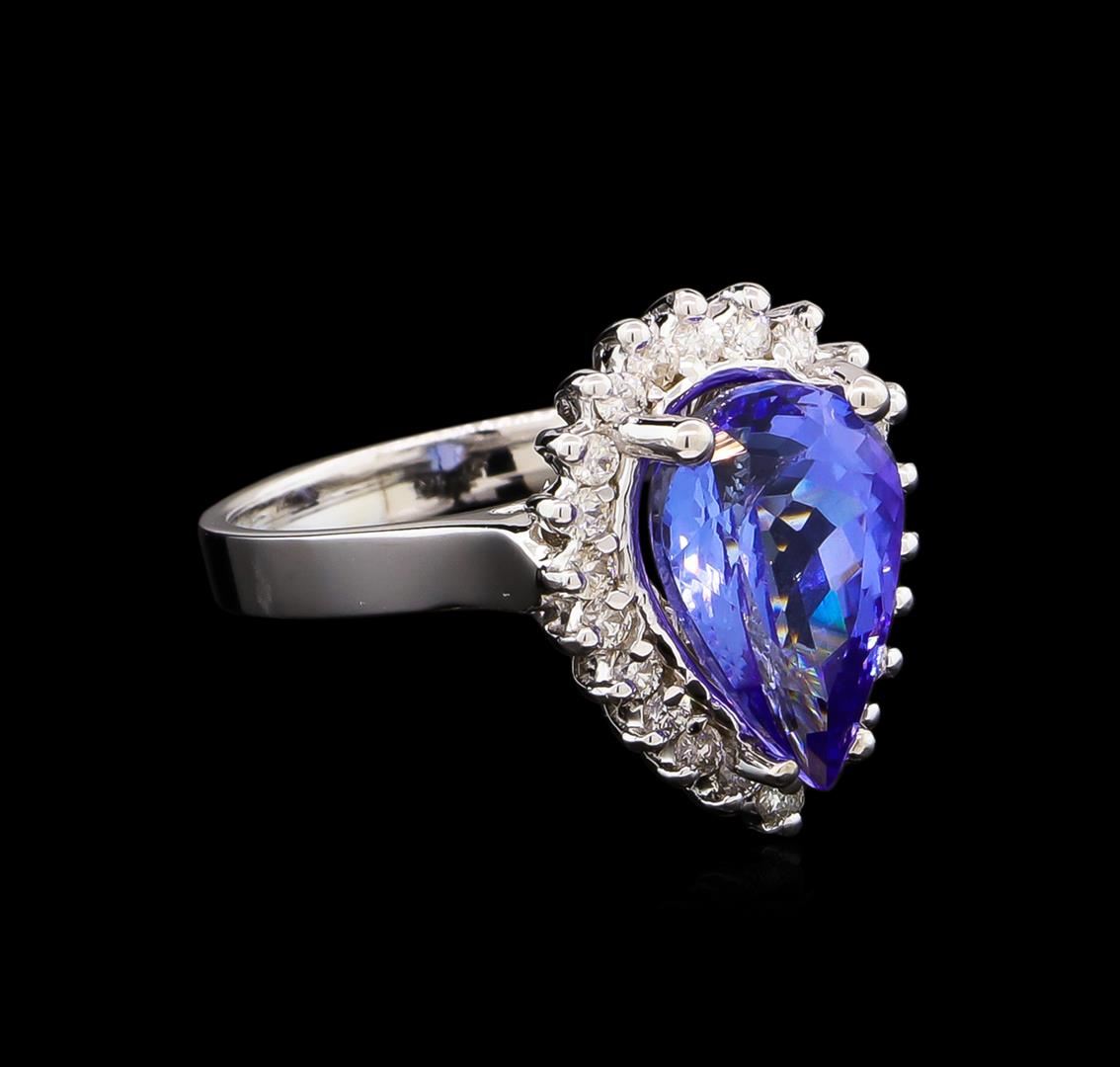 One electronically tested 14KT white gold lady's cast fashion ring with a basket halo with a bright polish finish. The featured lady's ring has a shank measuring 2.80 millimeters wide. Identified with markings of "14K". Condition is new, good workmanship. Containing: One prong set pear modified brilliant cut natural tanzanite, measuring 12.65 x 8.43 x 6.00mm, approximate weight of 4.08ct., clarity is eye clean, type I, medium, moderately strong, violetish blue color, (GIA vB 5/4), cut is very good. Transmitting light with no distortion, transparent. Colored gemstones are presumed to have been subjected to commonly used enhancement processes. Graded in the setting. Twenty-Two prong set round brilliant cut diamonds, measuring 1.70 - 1.65 x 1.04mm (depth est.) approximate total weight of 22 Stones = 0.40ct. Graded in the setting. Clarity: SI-1 to SI-2. Color: H - I. Cut Good. Total Weight of Colored Stones 4.08ct. Total Weight of Diamonds 0.40ct. Total Weight of Ring 6.00gm. GAS Appraised at $8,345.00.