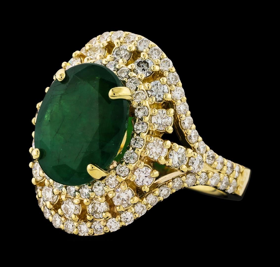 One electronically tested 14KT yellow gold lady's cast fashion ring with a split shank halo with a bright polish finish. The featured lady's ring has a shank measuring 3.86 millimeters wide. Identified with markings of 'K14'. Condition is new, good workmanship. Containing: One prong set oval modified mixed cut natural emerald, measuring 12.00 x 9.29 x 5.00mm, (depth est.) 25%. bulge factor, approximate weight of 4.10ct., clarity is heavily included, medium dark, moderately strong, green color, (GIA G 6/4), cut is good. Transmitting light somewhat diffusely, semi-transparent to translucent. Naturally occurring internal & external characteristics are present. Indications of oil residue. Colored gemstones are presumed to have been subjected to commonly used enhancement processes. Graded in the setting. Twenty prong set round brilliant cut diamonds, measuring 2.10 - 1.95 x 1.26mm (depth est.) approximate total weight of 20 Stones = 0.65ct. Graded in the setting. Clarity SI-1 to SI-2. Color: G - I Cut Good Seventy-Eight prong set round brilliant cut diamonds, measuring 1.45 - 1.35 x 0.87mm (depth est.) approximate total weight of 78 Stones = 0.82ct. Graded in the setting. Clarity SI-1 to SI-2. Color: G - I Cut Good. Total Weight of Colored Stones 4.10ct.. Total Weight of Diamonds 1.47ct.. Total Weight of Ring 9.00gm GAS Appraised at $8,165.00.