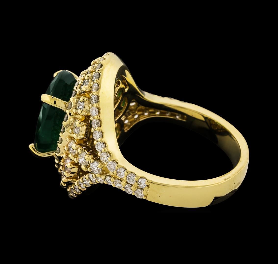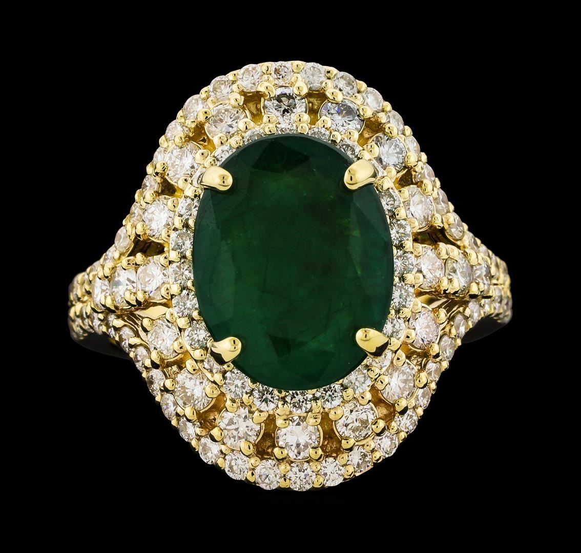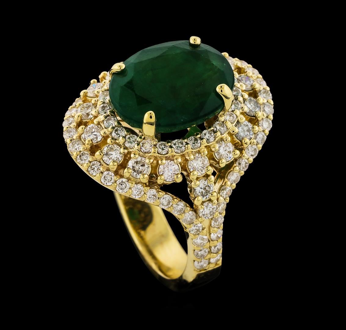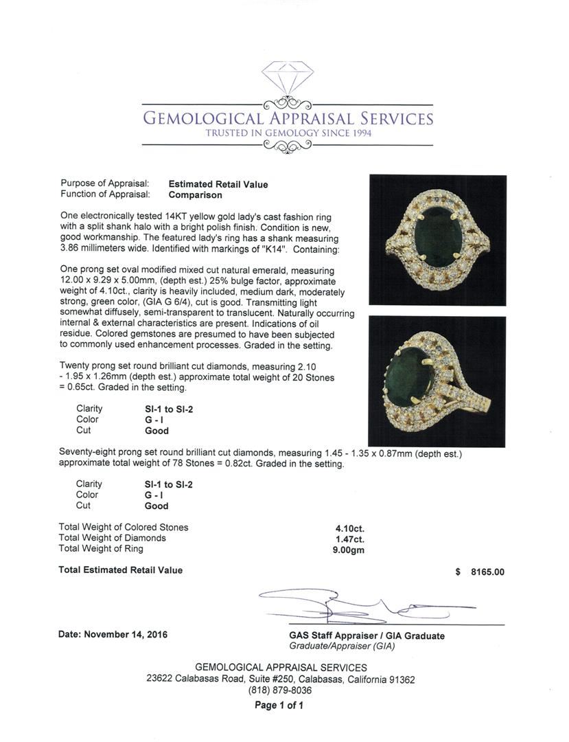 One electronically tested 14KT yellow gold lady's cast fashion ring with a split shank halo with a bright polish finish. The featured lady's ring has a shank measuring 3.86 millimeters wide. Identified with markings of 'K14'. Condition is new, good workmanship. Containing: One prong set oval modified mixed cut natural emerald, measuring 12.00 x 9.29 x 5.00mm, (depth est.) 25%. bulge factor, approximate weight of 4.10ct., clarity is heavily included, medium dark, moderately strong, green color, (GIA G 6/4), cut is good. Transmitting light somewhat diffusely, semi-transparent to translucent. Naturally occurring internal & external characteristics are present. Indications of oil residue. Colored gemstones are presumed to have been subjected to commonly used enhancement processes. Graded in the setting. Twenty prong set round brilliant cut diamonds, measuring 2.10 - 1.95 x 1.26mm (depth est.) approximate total weight of 20 Stones = 0.65ct. Graded in the setting. Clarity SI-1 to SI-2. Color: G - I Cut Good Seventy-Eight prong set round brilliant cut diamonds, measuring 1.45 - 1.35 x 0.87mm (depth est.) approximate total weight of 78 Stones = 0.82ct. Graded in the setting. Clarity SI-1 to SI-2. Color: G - I Cut Good. Total Weight of Colored Stones 4.10ct.. Total Weight of Diamonds 1.47ct.. Total Weight of Ring 9.00gm GAS Appraised at $8,165.00.