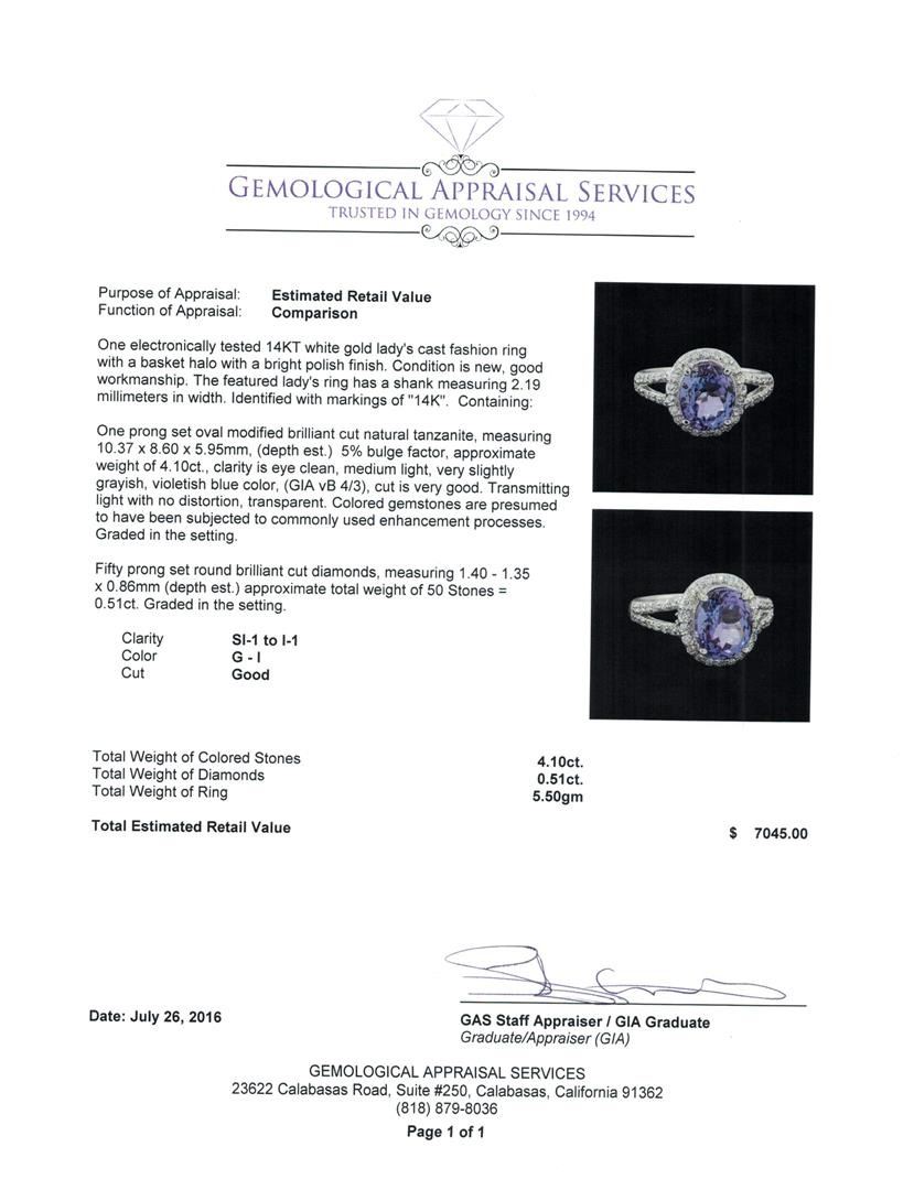 One electronically tested 14KT white gold lady's cast fashion ring with a basket halo with a bright polish finish. The featured lady's ring has a shank measuring 2.19 millimeters in width. Identified with markings of '14K'. Condition is new, good workmanship. Containing: One prong set oval modified brilliant cut natural tanzanite, measuring 10.37 x 8.60 x 5.95mm, (depth est.) 5%. bulge factor, approximate weight of 4.10ct., clarity is eye clean, medium light, very slightly grayish, violetish blue color, (GIA vB 4/3), cut is very good. Transmitting light with no distortion, transparent. Colored gemstones are presumed to have been subjected to commonly used enhancement processes. Graded in the setting. Fifty prong set round brilliant cut diamonds, measuring 1.40 - 1.35 x 0.86mm (depth est.) approximate total weight of 50 Stones = 0.51ct. Graded in the setting. Clarity SI-1 to I-1. Color: G - I Cut Good. Total Weight of Colored Stones 4.10ct.. Total Weight of Diamonds 0.51ct.. Total Weight of Ring 5.50gm. GAS Appraised at $7,045.00.