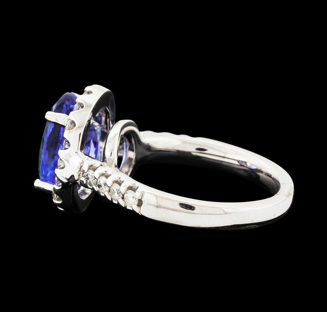 One electronically tested 14KT white gold lady's cast fashion ring with a basket halo with a bright polish finish. The featured lady's ring has a shank measuring 2.52 millimeters wide. Identified with markings of '14K'. Condition is new, good workmanship. Containing: One prong set oval modified brilliant cut natural tanzanite, measuring 11.14 x 8.08 x 5.61mm, (depth est.) 15%. bulge factor, approximate weight of 4.10ct., clarity is eye clean, medium light, moderately strong, violet color, (GIA V 4/4), cut is good. Transmitting light with no distortion, transparent. Colored gemstones are presumed to have been subjected to commonly used enhancement processes. Graded in the setting. Eight prong set round brilliant cut diamonds, measuring 2.00 - 1.90 x 1.19mm (depth est.) approximate total weight of 8 Stones = 0.22ct. Graded in the setting. Clarity SI-1 to SI-2. Color: H - I Cut Good Eighteen prong set round brilliant cut diamonds, measuring 1.80 - 1.70 x 1.09mm (depth est.) approximate total weight of 18 Stones = 0.38ct. Graded in the setting. Clarity SI-1 to SI-2. Color: H - I Cut Good. Total Weight of Colored Stones 4.10ct.. Total Weight of Diamonds 0.60ct.. Total Weight of Ring 6.60gm. GAS Appraised at $7,125.00.
