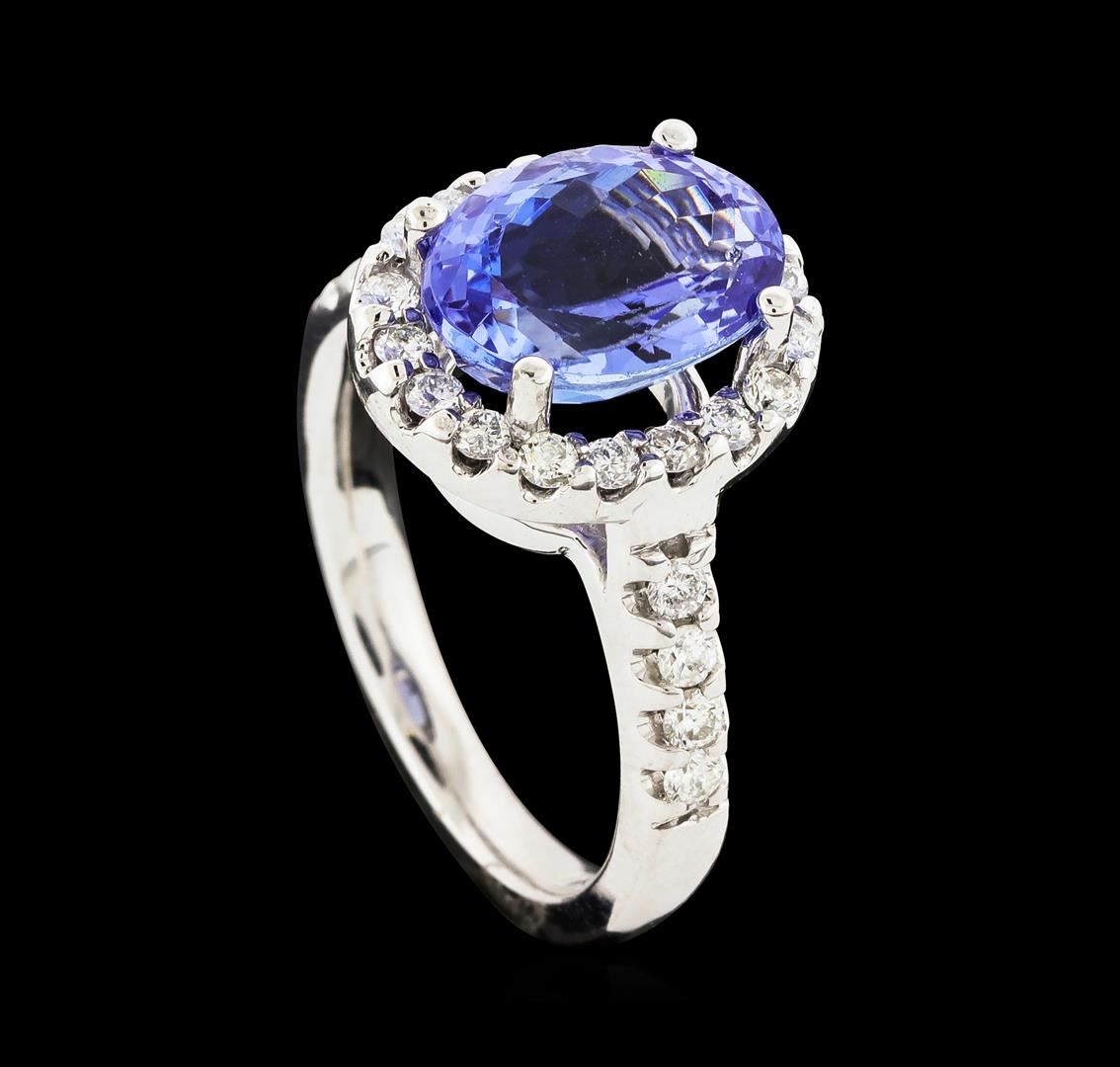 One electronically tested 14KT white gold lady's cast fashion ring with a basket halo with a bright polish finish. The featured lady's ring has a shank measuring 2.52 millimeters wide. Identified with markings of '14K'. Condition is new, good workmanship. Containing: One prong set oval modified brilliant cut natural tanzanite, measuring 11.14 x 8.08 x 5.61mm, (depth est.) 15%. bulge factor, approximate weight of 4.10ct., clarity is eye clean, medium light, moderately strong, violet color, (GIA V 4/4), cut is good. Transmitting light with no distortion, transparent. Colored gemstones are presumed to have been subjected to commonly used enhancement processes. Graded in the setting. Eight prong set round brilliant cut diamonds, measuring 2.00 - 1.90 x 1.19mm (depth est.) approximate total weight of 8 Stones = 0.22ct. Graded in the setting. Clarity SI-1 to SI-2. Color: H - I Cut Good Eighteen prong set round brilliant cut diamonds, measuring 1.80 - 1.70 x 1.09mm (depth est.) approximate total weight of 18 Stones = 0.38ct. Graded in the setting. Clarity SI-1 to SI-2. Color: H - I Cut Good. Total Weight of Colored Stones 4.10ct.. Total Weight of Diamonds 0.60ct.. Total Weight of Ring 6.60gm. GAS Appraised at $7,125.00.