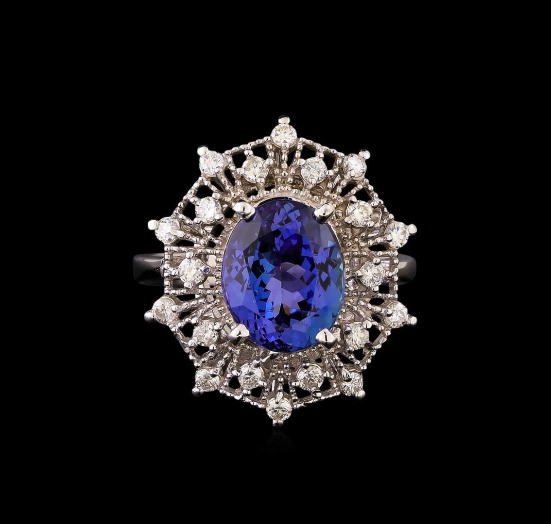 One electronically tested 14KT white gold lady's cast fashion ring with a double basket halo with a bright polish with milgrain detailing finish. The featured lady's ring has a shank measuring 2.67 millimeters in width. Identified with markings of 'K14'. Condition is new, good workmanship. Containing: One prong set oval modified brilliant cut natural tanzanite, measuring 10.89 x 8.84 x 5.90mm, (depth est.) approximate weight of 4.10ct., clarity is eye clean, medium, moderately strong, bluish violet color, (GIA bV 5/4), cut is very good. Transmitting light with no distortion, transparent. Colored gemstones are presumed to have been subjected to commonly used enhancement processes. Graded in the setting. Twenty prong set round brilliant cut diamonds, measuring 1.95 - 1.85 x 1.18mm (depth est.) approximate total weight of 20 Stones = 0.52ct. Graded in the setting. Clarity SI-1 to SI-2. Color: G - I Cut Good. Total Weight of Colored Stones 4.10ct.. Total Weight of Diamonds 0.52ct.. Total Weight of Ring 6.20gm. GAS Appraised at $8,485.00.