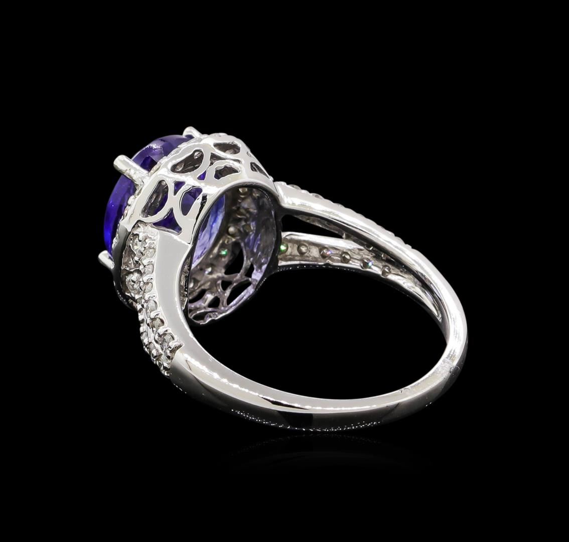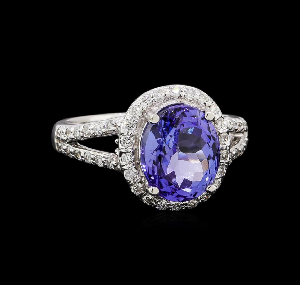One electronically tested 14KT white gold lady's cast fashion ring with a basket halo with a bright polish finish. The featured lady's ring has a shank measuring 2.19 millimeters in width. Identified with markings of '14K'. Condition is new, good workmanship. Containing: One prong set oval modified brilliant cut natural tanzanite, measuring 10.37 x 8.60 x 5.95mm, (depth est.) 5%. bulge factor, approximate weight of 4.10ct., clarity is eye clean, medium light, very slightly grayish, violetish blue color, (GIA vB 4/3), cut is very good. Transmitting light with no distortion, transparent. Colored gemstones are presumed to have been subjected to commonly used enhancement processes. Graded in the setting. Fifty prong set round brilliant cut diamonds, measuring 1.40 - 1.35 x 0.86mm (depth est.) approximate total weight of 50 Stones = 0.51ct. Graded in the setting. Clarity SI-1 to I-1. Color: G - I Cut Good. Total Weight of Colored Stones 4.10ct.. Total Weight of Diamonds 0.51ct.. Total Weight of Ring 5.50gm. GAS Appraised at $7,045.00.