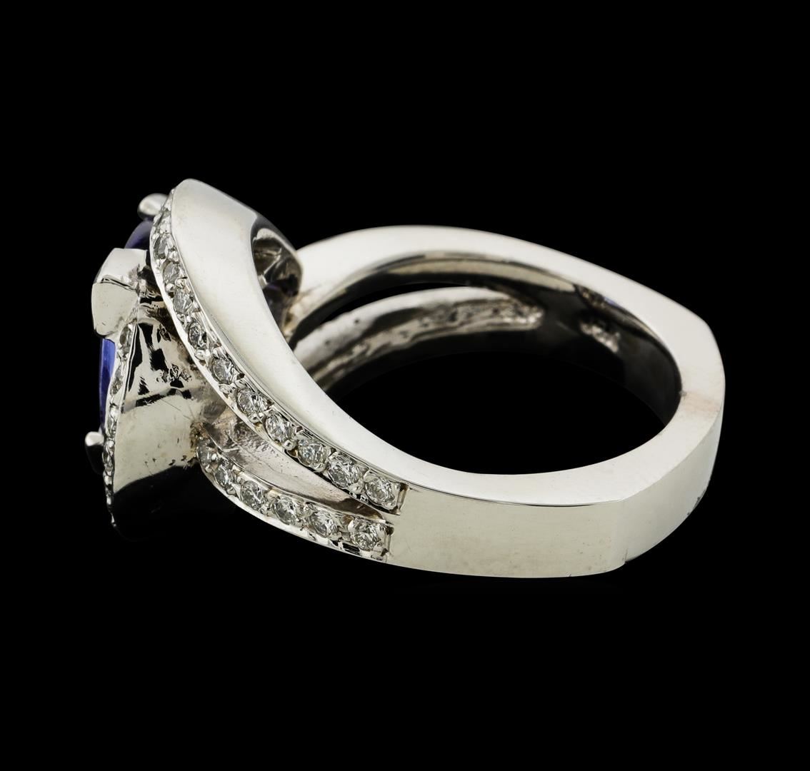 One electronically tested 14KT white gold lady's cast fashion ring with a bypass swirl with a bright polish finish. The featured lady's ring has a European shank measuring 3.60 millimeters wide. Identified with markings of '14K'. Condition is new, good workmanship. Containing: One prong set triangle modified brilliant cut natural tanzanite, measuring 11.00 x 10.75 x 5.75mm, (depth est.) approximate weight of 4.10ct., clarity is eye clean, medium, moderately strong, violet color, (GIA V 5/4), cut is very good. Transmitting light with no distortion, transparent. Colored gemstones are presumed to have been subjected to commonly used enhancement processes. Graded in the setting. Fifty-Two bead set round brilliant cut diamonds, measuring 1.40 - 1.30 x 0.84mm (depth est.) approximate total weight of 52 Stones = 0.50ct. Graded in the setting. Clarity VS-2 to SI-1. Color: H - I Cut Good. Total Weight of Colored Stones 4.10ct.. Total Weight of Diamonds 0.50ct.. Total Weight of Ring 10.50gm. GAS Appraised at $8,885.00.