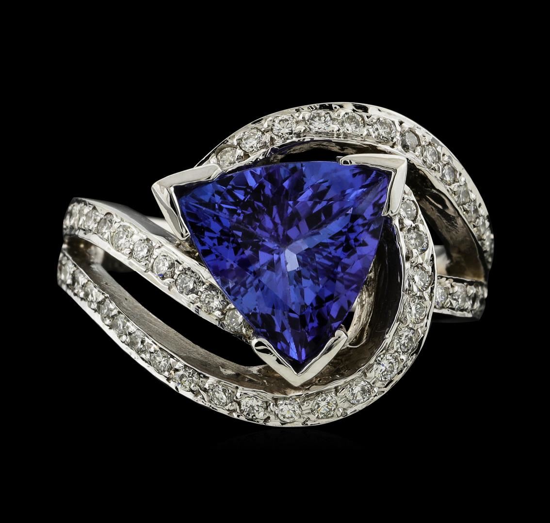 One electronically tested 14KT white gold lady's cast fashion ring with a bypass swirl with a bright polish finish. The featured lady's ring has a European shank measuring 3.60 millimeters wide. Identified with markings of '14K'. Condition is new, good workmanship. Containing: One prong set triangle modified brilliant cut natural tanzanite, measuring 11.00 x 10.75 x 5.75mm, (depth est.) approximate weight of 4.10ct., clarity is eye clean, medium, moderately strong, violet color, (GIA V 5/4), cut is very good. Transmitting light with no distortion, transparent. Colored gemstones are presumed to have been subjected to commonly used enhancement processes. Graded in the setting. Fifty-Two bead set round brilliant cut diamonds, measuring 1.40 - 1.30 x 0.84mm (depth est.) approximate total weight of 52 Stones = 0.50ct. Graded in the setting. Clarity VS-2 to SI-1. Color: H - I Cut Good. Total Weight of Colored Stones 4.10ct.. Total Weight of Diamonds 0.50ct.. Total Weight of Ring 10.50gm. GAS Appraised at $8,885.00.