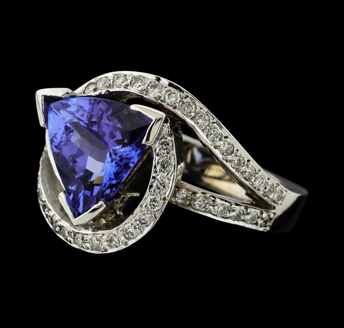 One electronically tested 14KT white gold lady's cast fashion ring with a bypass swirl with a bright polish finish. The featured lady's ring has a European shank measuring 3.60 millimeters wide. Identified with markings of '14K'. Condition is new, good workmanship. Containing: One prong set triangle modified brilliant cut natural tanzanite, measuring 11.00 x 10.75 x 5.75mm, (depth est.) approximate weight of 4.10ct., clarity is eye clean, medium, moderately strong, violet color, (GIA V 5/4), cut is very good. Transmitting light with no distortion, transparent. Colored gemstones are presumed to have been subjected to commonly used enhancement processes. Graded in the setting. Fifty-Two bead set round brilliant cut diamonds, measuring 1.40 - 1.30 x 0.84mm (depth est.) approximate total weight of 52 Stones = 0.50ct. Graded in the setting. Clarity VS-2 to SI-1. Color: H - I Cut Good. Total Weight of Colored Stones 4.10ct.. Total Weight of Diamonds 0.50ct.. Total Weight of Ring 10.50gm. GAS Appraised at $8,885.00.