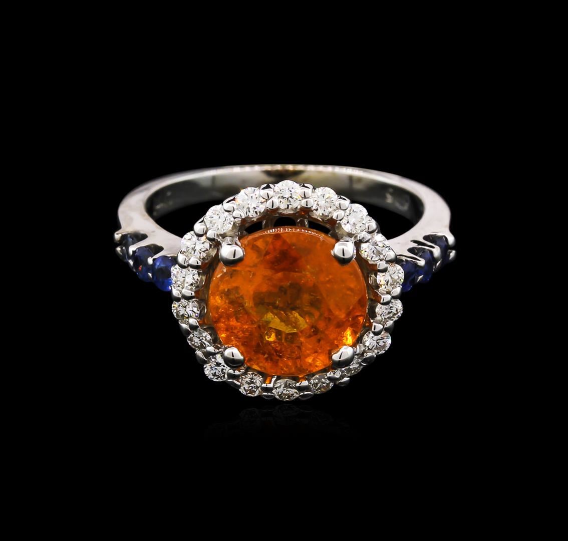 One electronically tested 14KT white gold lady's cast fashion ring with a halo with a bright polish finish. The featured lady's ring has a shank measuring 1.95 millimeters wide. Identified with markings of "14K". Condition is new, good workmanship. Containing: One prong set round modified brilliant cut natural spessartite garnet, measuring 9.14 - 9.10 x 5.97 mm, approximate weight of 4.10ct., clarity is moderately included, type II, medium dark, moderately strong, orange color, (GIA O 6/4), cut is good. Colored gemstones are presumed to have been subjected to commonly used enhancement processes. Graded in the setting. Six prong set round modified brilliant cut natural blue sapphires, measuring 2.20 - 1.90 x 1.23 mm, approximate total weight of 0.24ct., clarity is slightly included, type II, medium, slightly grayish, blue color, (GIA B 5/2), cut is good. Colored gemstones are presumed to have been subjected to commonly used enhancement processes. Graded in the setting. Eighteen prong set round brilliant cut diamonds, measuring 1.70 - 1.60 x 1.07mm (depth est.) approximate total weight of 18 Stones = 0.33ct. Graded in the setting. Clarity: VS-2 to SI-1. Color: H - I. Cut Good. Total Weight of Colored Stones 4.34ct. Total Weight of Diamonds 0.33ct. Total Weight of Ring 4.90gm at $2540.00.. GAS Appraised at $2,540.00.