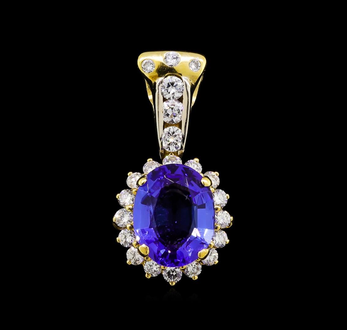 One electronically tested 18KT yellow gold lady's combination cast & assembled fashion pendant with a basket halo with a bright polish finish. Condition is used, good workmanship. Containing: One prong set oval modified brilliant cut natural tanzanite, measuring 12.13 x 9.53 x 4.80mm, 5%. bulge factor, approximate weight of 4.10ct., clarity is eye clean, type I, medium, moderately strong, violetish blue color, (GIA vB 5/4), cut is very good. Transmitting light with no distortion, transparent. Colored gemstones are presumed to have been subjected to commonly used enhancement processes. Graded in the setting. Three channel set round brilliant cut diamonds, measuring 3.00 - 2.85 x 1.85mm (depth est.) approximate total weight of 3 Stones = 0.30ct. Graded in the setting. Clarity: VS-1 to VS-2. Color: G - Good Sixteen prong set round brilliant cut diamonds, measuring 2.00 - 1.90 x 1.21mm (depth est.) approximate total weight of 16 Stones = 0.45ct. Graded in the setting. Clarity: VS-2 to SI-1. Color: H - I. Cut Good Three bezel set round brilliant cut diamonds, measuring 1.80 - 1.70 x 1.09mm (depth est.) approximate total weight of 3 Stones = 0.06ct. Graded in the setting. Clarity: VS-2 to SI-1. Color: H - I. Cut Good. Total Weight of Colored Stones 4.10ct. Total Weight of Diamonds 0.81ct. Total Weight of Pendant 5.70gm. GAS Appraised at $9,605.00.