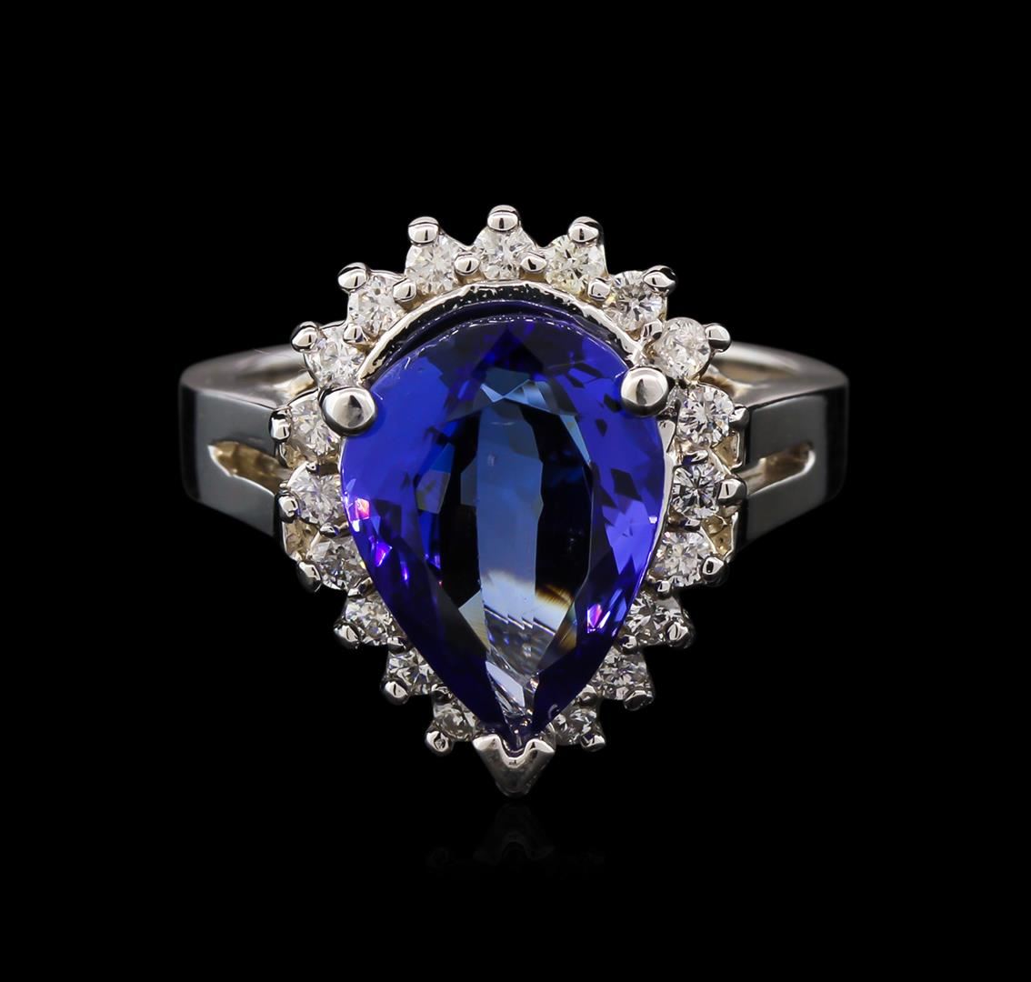 One electronically tested 14KT white gold ladies cast tanzanite and diamond ring with a bright polish finish. The ring features a pear shaped tanzanite set within a gallery of round brilliant diamonds, supported by a ribbed under gallery, completed by a three millimeter wide band. Identified with markings of "14K". Condition is new, good workmanship. Containing: One prong set pear mixed cut natural tanzanite, measuring 12.80 x 9.50 x 5.40mm, exact weight 4.10ct., clarity is eye clean, type II, dark, moderately strong, blue color, (GIA B 7/4), cut is good. Transmitting light with no distortion, transparent. Naturally occurring external characteristics are present. Graded in the setting. Tanzanite is a very rare gemstone that is only found in the country of Tanzania. Originally discovered in 1967. Tiffany & Company, named the stone Tanzanite. It is found in the Usumburu Mountains that border the Umba Valley of northern Tanzania. Tanzanite occurs in gray, brown, violet, blue, reddish-purple, & green. The gem is interesting because of its exceptional pleochroism. Rotated in different directions a tanzanite will exhibit multiple changes of color. Tanzanite has a low tolerance to ultrasonic cleaning, and should not be cleaned using this method. Twenty-Eight prong set round brilliant cut diamonds, measuring 2.00 - 1.75 x 1.11mm exact total weight 28 Stones = 0.59ct. Graded in the setting. Clarity: SI-2 to I-1. Color: G - H. Total Weight of Colored Stones 4.10ct. Total Weight of Diamonds 0.59ct. Total Weight of Ring 8.25gm. AIG Appraised at $12,440.00.