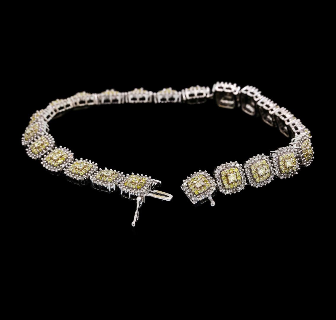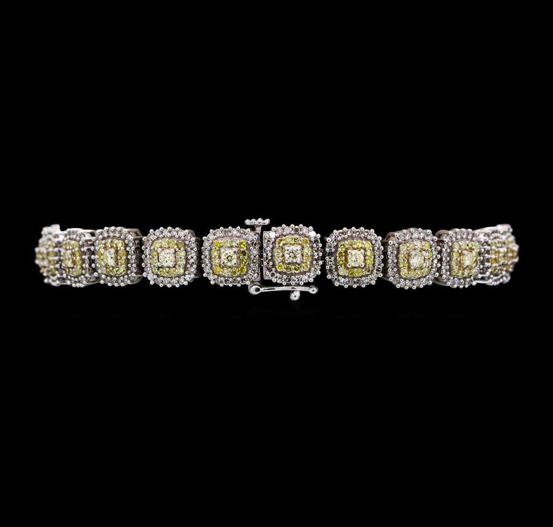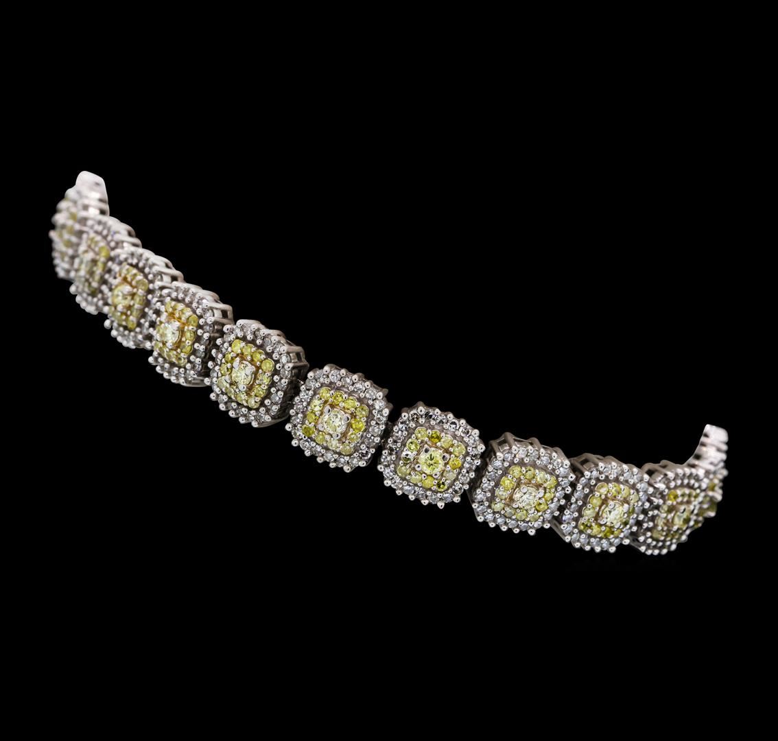 One electronically tested 14KT white gold ladies cast & assembled diamond bracelet with a bright polish finish. Seven and three-eighths inch length bracelet features a flexible diamond cluster link ribbon, terminating in a concealed clasp with safety. Identified with markings of '10K'. Condition is good. Containing: Twenty-Three prong set round brilliant cut diamonds, measuring 2.10 - 2.00 x 1.23mm (depth est.) approximate total weight of 23 Stones = 0.82ct. The group is composed of a mix of natural and laboratory enhanced light yellowish brown, light brown andfancy brownish yellow color diamonds. Graded in the setting. Clarity SI-1 to SI-2 Two Hundred Seventy-Six prong set single cut diamonds, measuring 1.10 - 1.00 x 0.63mm (depth est.) approximate total weight of 276 Stones = 1.26ct. The group is composed of a mix of laboratory enhanced fancy yellow and fancy greenish yellow color diamonds. Graded in the setting. Clarity SI-2 to I-1 Four Hundred Sixty prong set single cut diamonds, measuring 1.10 - 1.00 x 0.63mm (depth est.) approximate total weight of 460 Stones = 2.03ct. Graded in the setting. Clarity VS-2 to SI-1. Color: H - J. Total Weight of Diamonds 4.11ct.. Total Weight of Bracelet 18.31gm. AIG Appraised at $15,190.00.