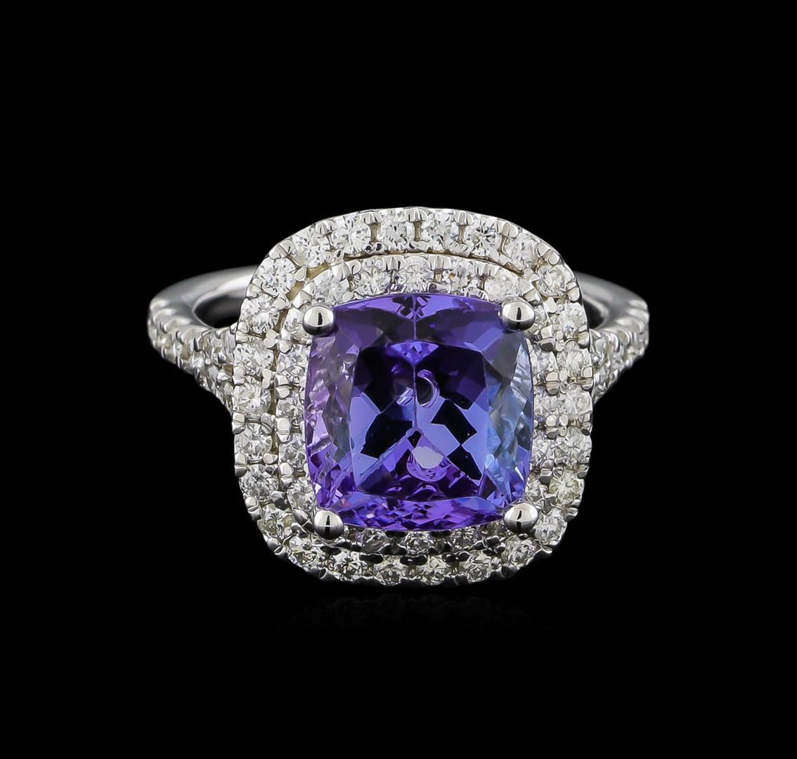 One electronically tested 14KT white gold lady's cast fashion ring with a split shank double halo with a bright polish finish. The featured lady's ring has a shank measuring 1.71 millimeters wide. Identified with markings of "14K". Condition is new, good workmanship. Containing: One prong set rectangular cushion modified brilliant cut natural tanzanite, measuring 9.49 x 8.84 x 6.43mm, approximate weight of 4.12ct., clarity is eye clean, type I, medium, very slightly grayish, bluish violet color, (GIA bV 5/3), cut is good. Transmitting light with no distortion, transparent. Colored gemstones are presumed to have been subjected to commonly used enhancement processes. Graded in the setting. Seventy prong set round brilliant cut diamonds, measuring 1.60 - 1.35 x 0.92mm (depth est.) approximate total weight of 70 Stones = 0.87ct. Graded in the setting. Clarity: SI-1 to I-1. Color: G - Good. Total Weight of Colored Stones 4.12ct. Total Weight of Diamonds 0.87ct. Total Weight of Ring 6.00gm. GAS Appraised at $6,545.00.