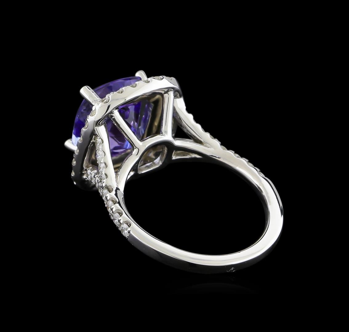 One electronically tested 14KT white gold lady's cast fashion ring with a split shank double halo with a bright polish finish. The featured lady's ring has a shank measuring 1.71 millimeters wide. Identified with markings of "14K". Condition is new, good workmanship. Containing: One prong set rectangular cushion modified brilliant cut natural tanzanite, measuring 9.49 x 8.84 x 6.43mm, approximate weight of 4.12ct., clarity is eye clean, type I, medium, very slightly grayish, bluish violet color, (GIA bV 5/3), cut is good. Transmitting light with no distortion, transparent. Colored gemstones are presumed to have been subjected to commonly used enhancement processes. Graded in the setting. Seventy prong set round brilliant cut diamonds, measuring 1.60 - 1.35 x 0.92mm (depth est.) approximate total weight of 70 Stones = 0.87ct. Graded in the setting. Clarity: SI-1 to I-1. Color: G - Good. Total Weight of Colored Stones 4.12ct. Total Weight of Diamonds 0.87ct. Total Weight of Ring 6.00gm. GAS Appraised at $6,545.00.